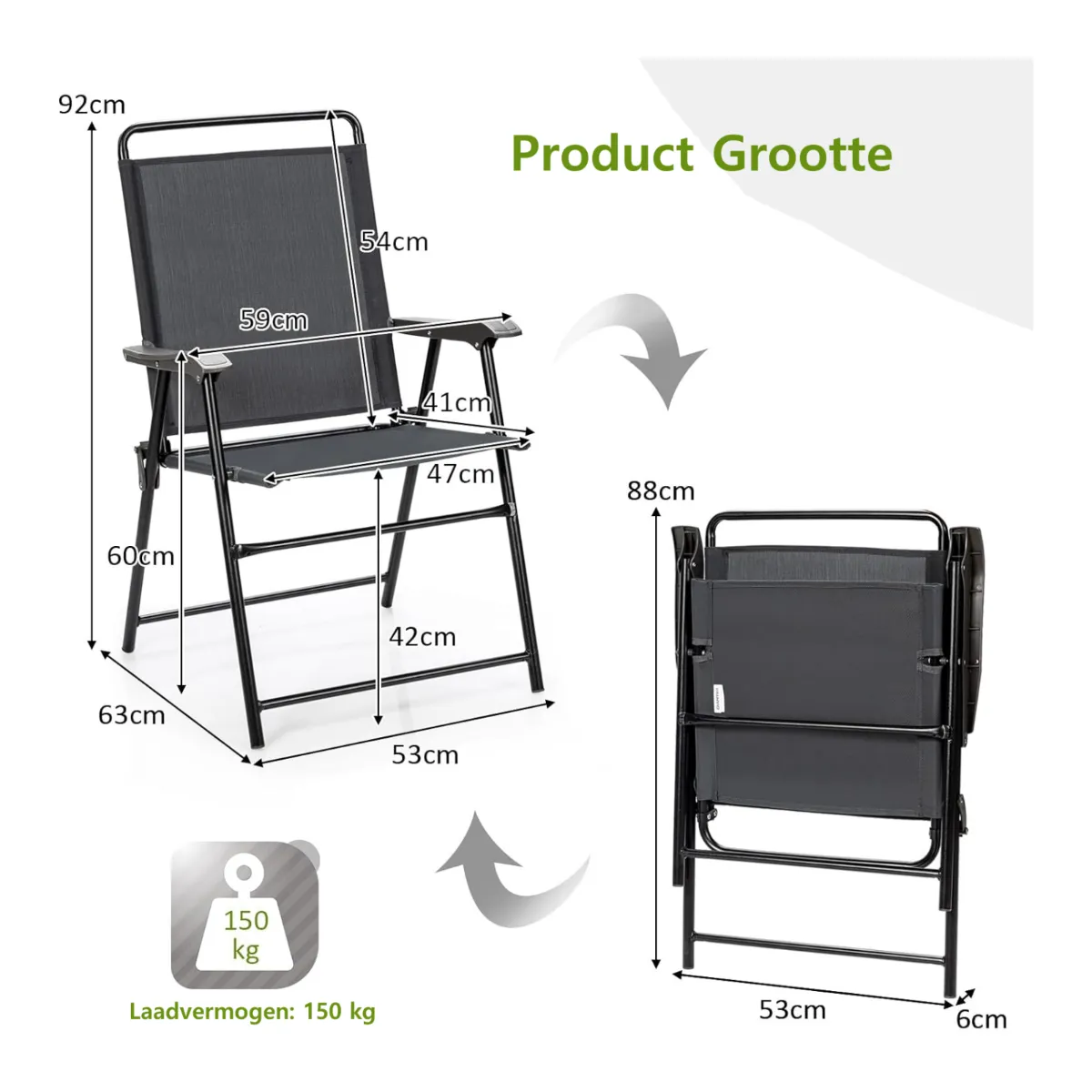 Onze 4 vouwstoelen zijn ideaal voor je buitenactiviteiten en heel praktisch om te vervoeren. Je kunt ze in de kofferbak van je auto leggen als je op stap gaat, want opgevouwen zijn ze compact en nemen ze niet veel ruimte in beslag. Het frame is gemaakt van hoogwaardige metalen buizen, met een roestbestendig oppervlak dat lang gebruikt kan worden. De stof is gemaakt van ademend materiaal, waardoor je comfortabel zit. Je hoeft niet bang te zijn dat de stoel wegglijdt, want hij is voorzien van antislipglijders.