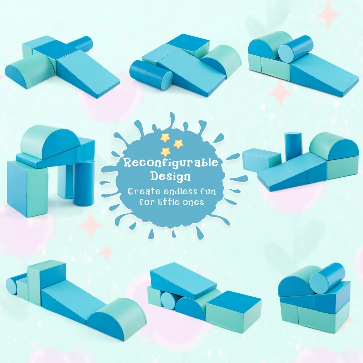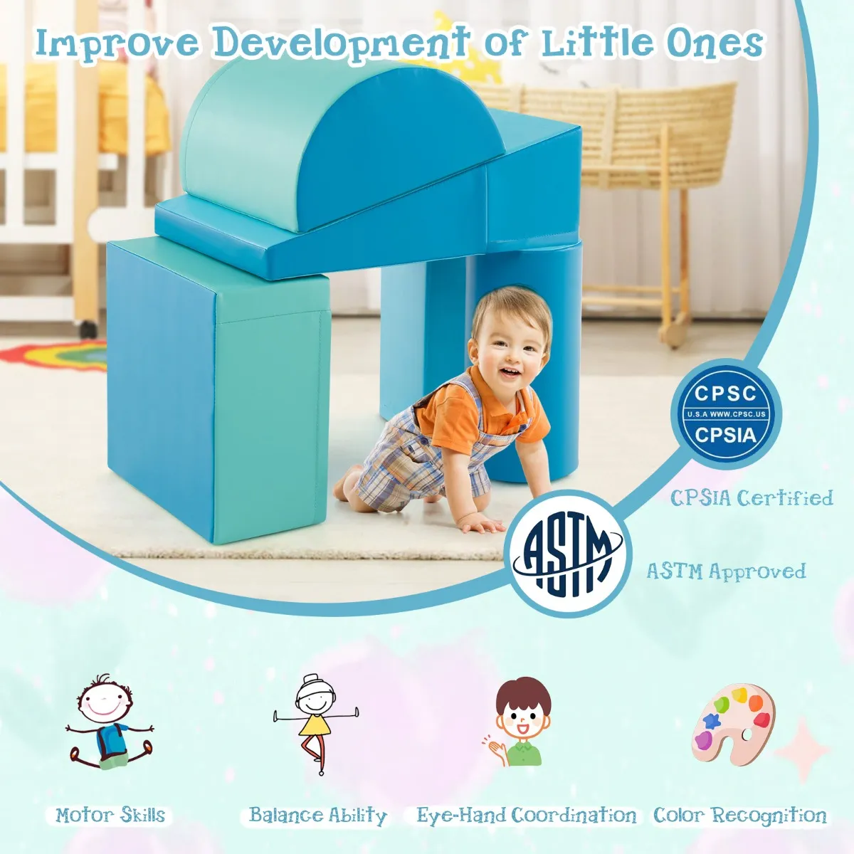 Deze schuimrubberen speelset bevat 5 zachte schuimrubberen blokken in verschillende vormen: kleine rechthoek, grote rechthoek, driehoek, cilinder en halve maan. De felle kleuren stimuleren kinderen om hun motorische vaardigheden, evenwicht en lichaamscoördinatie te verbeteren terwijl ze kruipen en klimmen, wat ouders een gerust gevoel geeft. De vulling van EPE-schuim vermindert schokken effectief en het zachte oppervlak en de hoeken beschermen kinderen tegen letsel. De waterdichte PU hoes heeft een soepele ritssluiting om snel te verwijderen.