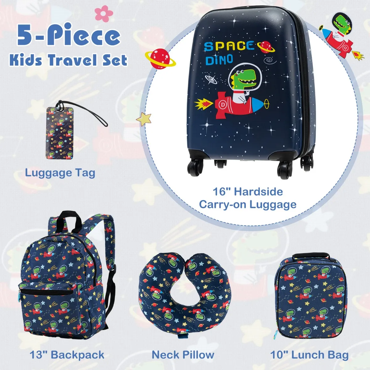 Kofferset voor kinderen bestaat uit 1 koffer, 1 rugzak, 1 lunchtas, 1 nekkussen en 1 label. De koffer en rugzak bieden ruimte voor reisbenodigdheden. Uitgerust met 4 wielen en een telescopisch handvat, kunnen ze moeiteloos gemanoeuvreerd worden met het verstelbare handvat. De geïsoleerde lunchtas houdt maaltijden koel. De rugzak en lunchtas zijn gemaakt van polyester en zijn waterdicht en slijtvast. De etui is gemaakt van duurzaam ABS en PC. Met zijn stijlvolle ontwerp is deze set een ideaal cadeau voor je kinderen.