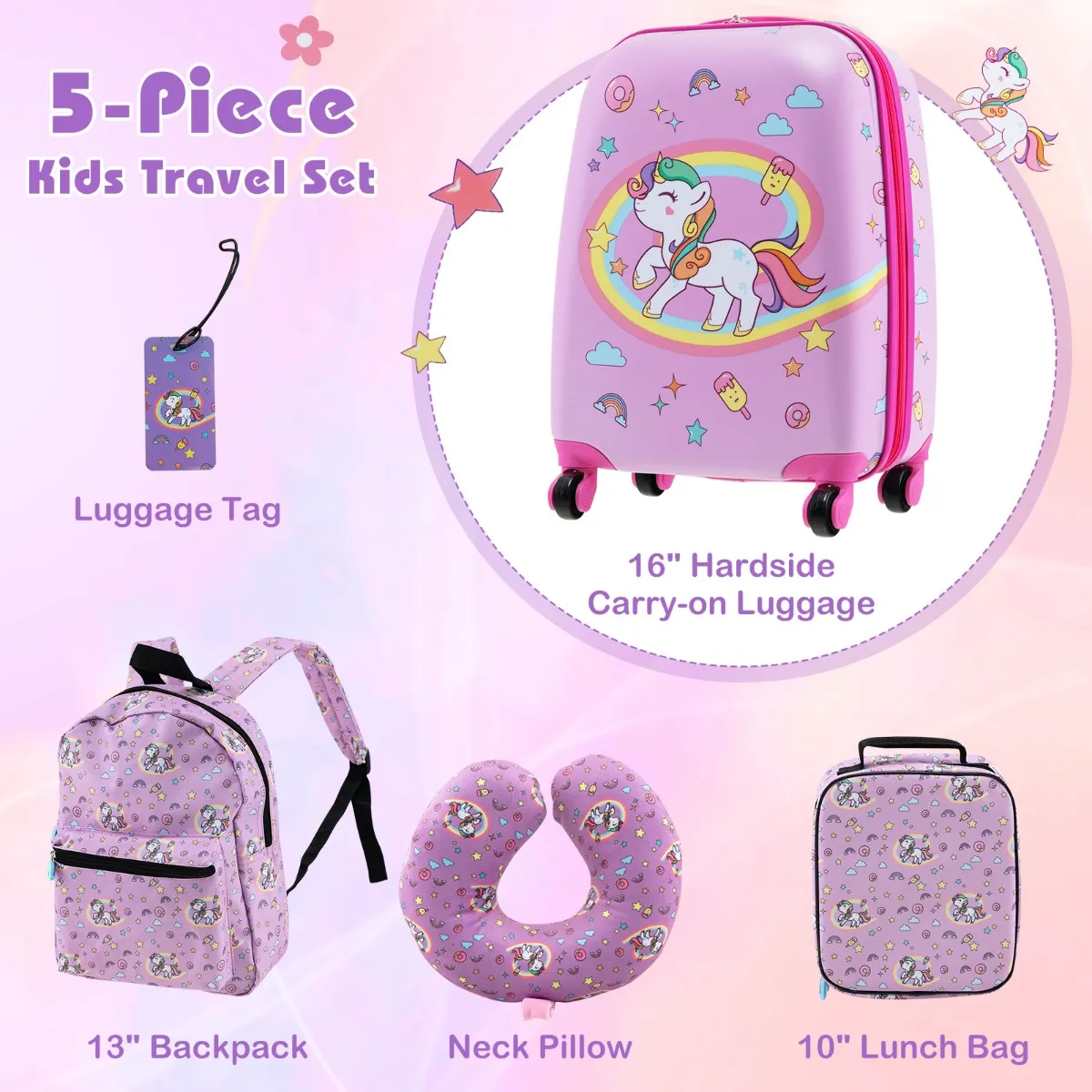 Kofferset voor kinderen bestaat uit 1 koffer, 1 rugzak, 1 lunchtas, 1 nekkussen en 1 label. De koffer en rugzak bieden ruimte voor reisbenodigdheden. Uitgerust met 4 wielen en een telescopisch handvat, kunnen ze moeiteloos gemanoeuvreerd worden met het verstelbare handvat. De geïsoleerde lunchtas houdt maaltijden koel. De rugzak en lunchtas zijn gemaakt van polyester en zijn waterdicht en slijtvast. De etui is gemaakt van duurzaam ABS en PC. Met zijn stijlvolle ontwerp is deze set een ideaal cadeau voor je kinderen.