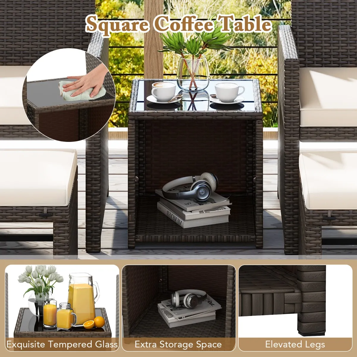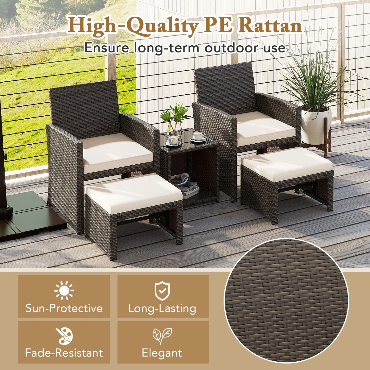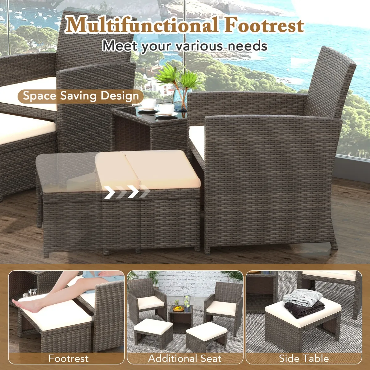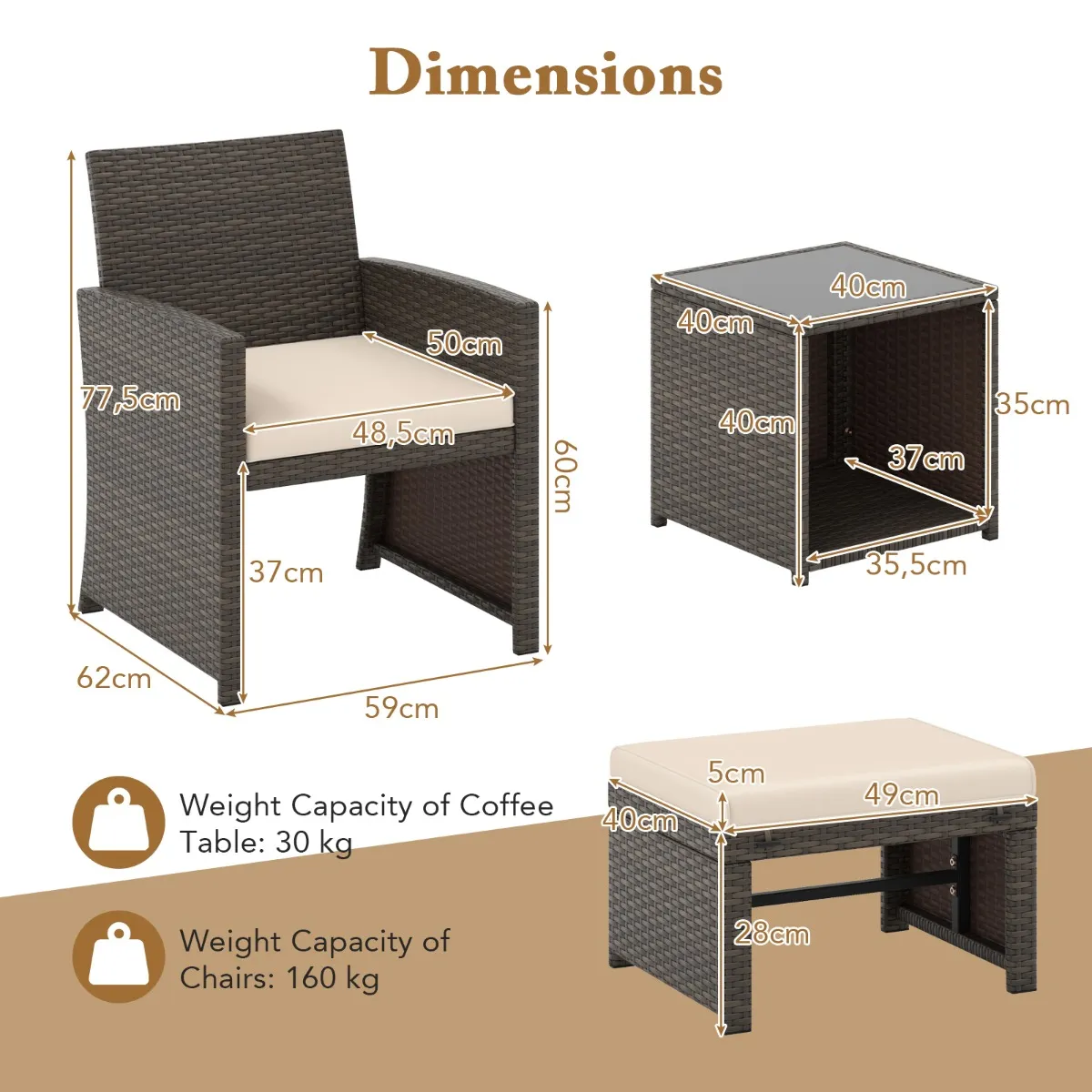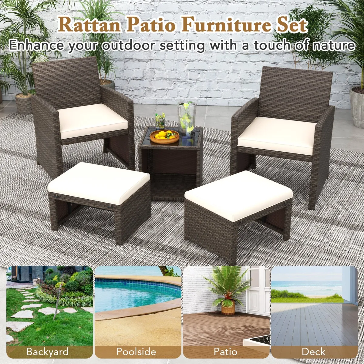 Deze 5-delige PE rotan gesprek set bevat 2 stoelen, 2 voetenbanken en 1 gehard glas salontafel voor u om te genieten van een comfortabele vrijetijdsbesteding. De stoelen en voetenbanken worden ondersteund door een stalen frame en versterkt door een X-vormige structuur, dus deze conversatieset voor buiten is weerbestendig en duurzaam. Dankzij het gestoffeerde kussen zorgen zowel de zitting als de voetensteun voor een comfortabele zitervaring. Het ontwerp met ritssluiting maakt het mogelijk om de zitting via het kussen schoon te maken en gemakkelijk te demonteren. Het is vermeldenswaard dat het blad en het interieur van deze salontafel van gehard glas ruim genoeg zijn voor opslag.