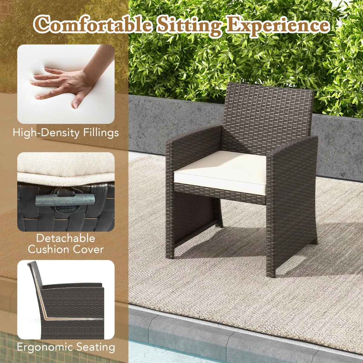 【5-delige PE rotan conversatie set】Of u nu vrienden uitnodigt als gasten of geniet van de zonsondergang met uw familie, deze 5-delige PE rotan meubelset is de beste metgezel. PE rotan is niet gemakkelijk te vervagen om ervoor te zorgen dat het kan worden gebruikt voor een lange tijd buiten. De X-vormige structuur is gewijd aan het verhogen van de stabiliteit en draagkracht.