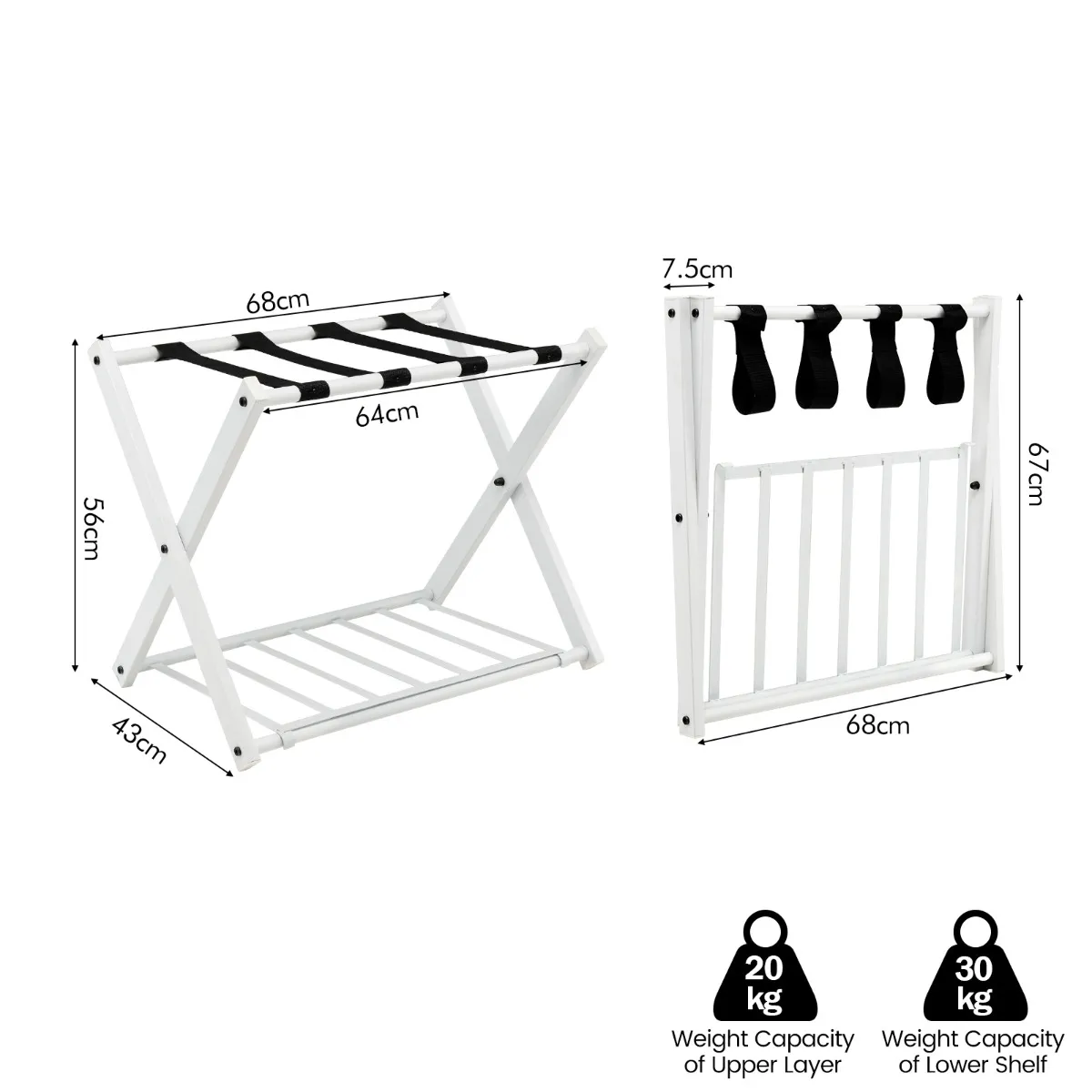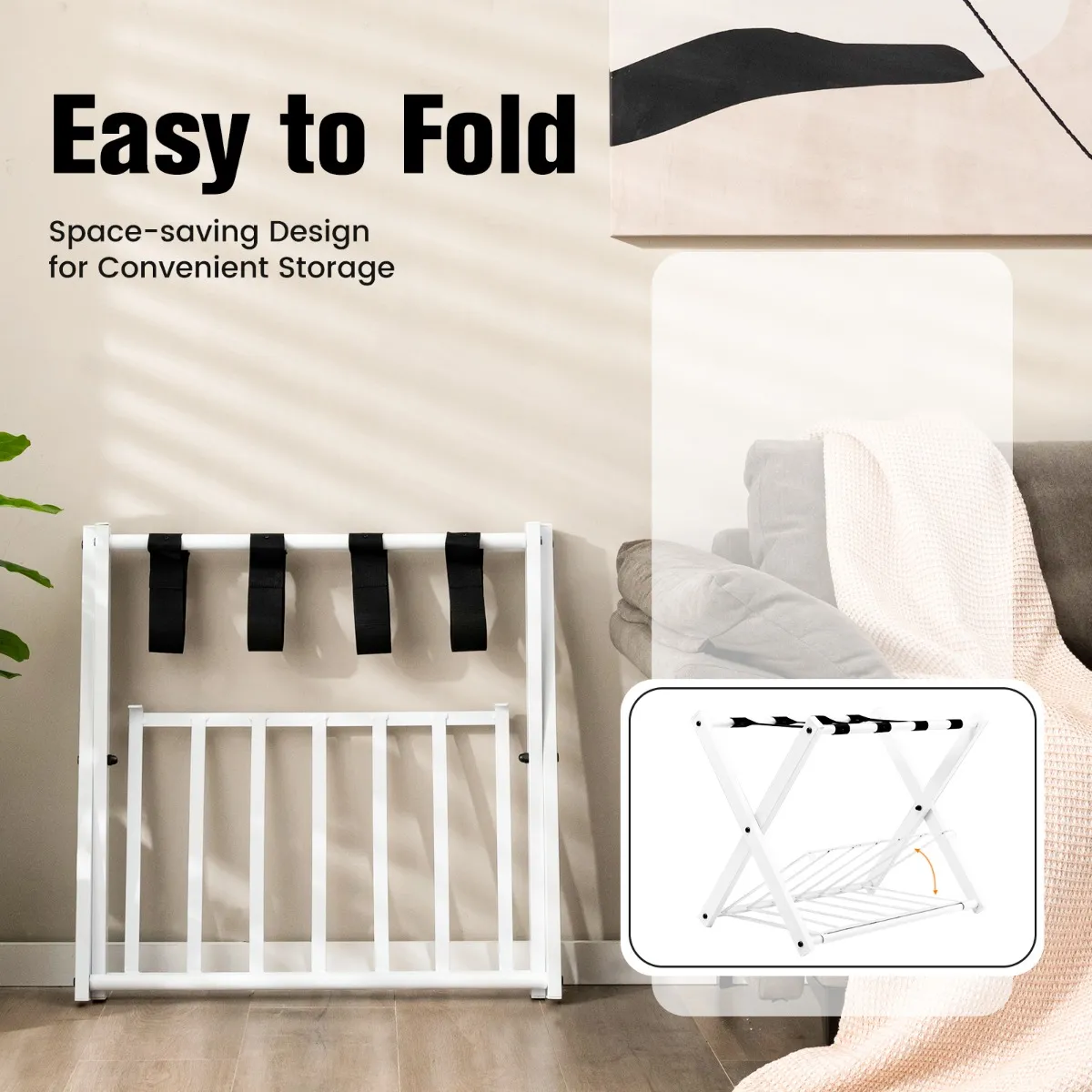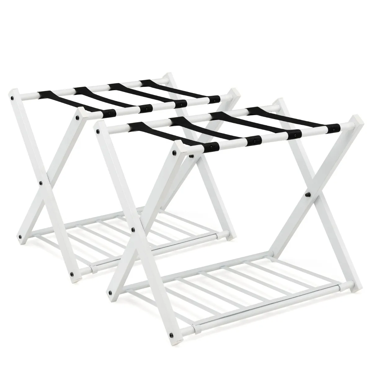 De onderste plank bestaat uit 7 stevige ijzeren buizen waar u uw schoenen, tassen of schoenen in kunt opbergen. Met een draagvermogen tot 50 kg voldoet het bagagerek aan uw opbergwensen. Door het opvouwbare ontwerp kunt u het bagagerek tegen de muur leunen om ruimte te besparen of in de kast op te bergen. Gebruik het kofferrek als plank in de slaapkamer, logeerkamer, hotelkamer en om je bagage netjes en comfortabel op te bergen.