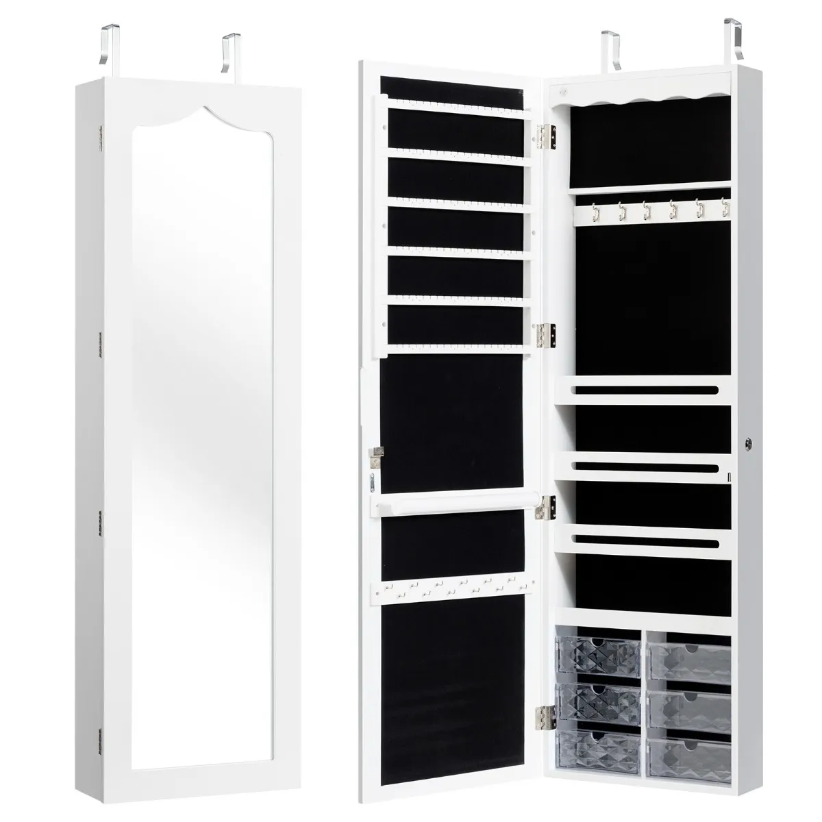 【Ruimtebesparend ontwerp】U kunt de sieradenkast aan de deur hangen met de haken met drie verstelbare hoogtes, of u kunt hem aan de muur bevestigen met de meegeleverde schroeven voor een maximale ruimtebenutting zonder dat u vloerruimte inneemt.