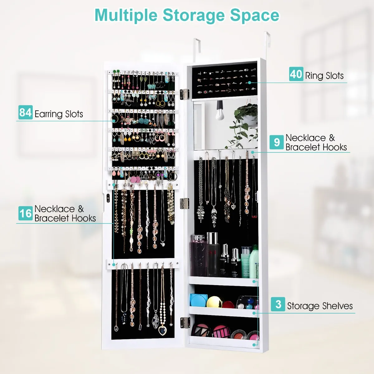 【Houd je sieraden goed georganiseerd】Deze sieradenkast beschikt over een compact design en biedt toch veel opbergruimte en ruimte voor je sieraden en make-up. Er zijn 6 beklede planken voor het bewaren van oorbellen (84 oorbelsleuven en 78 oorbelgaten), 25 haken voor halskettingen en armbanden, 40 ringsleuven en 3 opbergplanken.