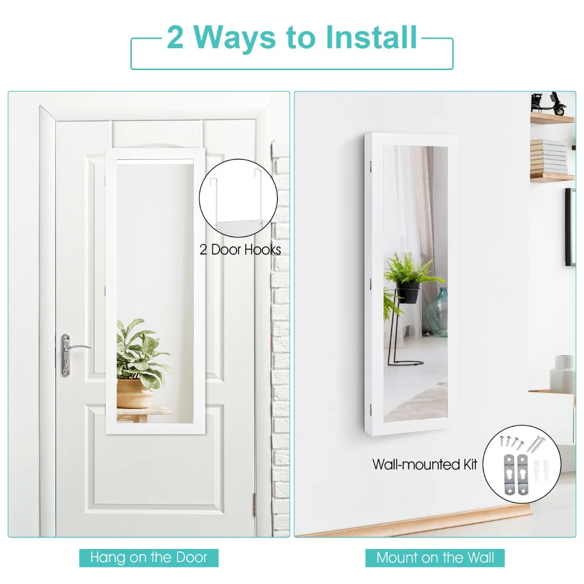 【2 installatiemogelijkheden beschikbaar】 Je kunt deze sieradenkast met de meegeleverde wandmontageset aan de muur monteren of met 2 haken over de deur hangen. Beide installatiemogelijkheden kunnen veel ruimte besparen en het je gemakkelijk maken om de sieradenkast overal in je slaapkamer, kast, woonkamer enz. te plaatsen.