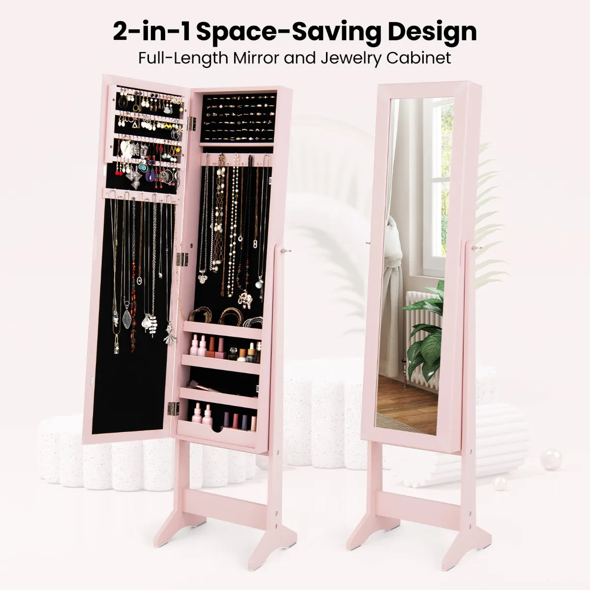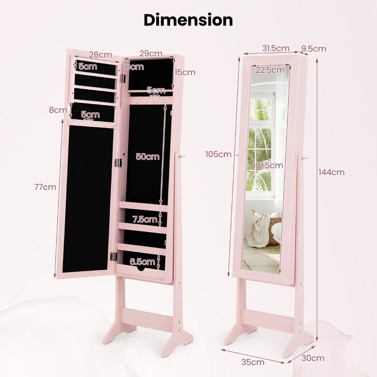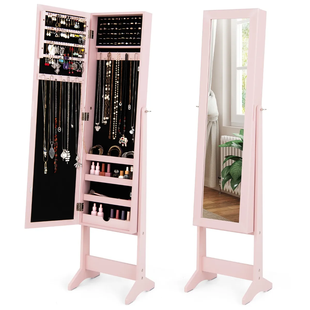 【2-in-1 spiegel & Kast】Gecombineerd met een spiegel en een juwelen organizer in een kast, kunt u met deze vrijstaande juwelen kast genieten van de dubbele voordelen en het eindeloze plezier van het aankleden. U kunt het gebruiken als een spiegel om u aan te kleden of als een praktische juwelenkast om uw waardevolle sieraden in op te bergen, waardoor u een schone en ruime ruimte heeft.
