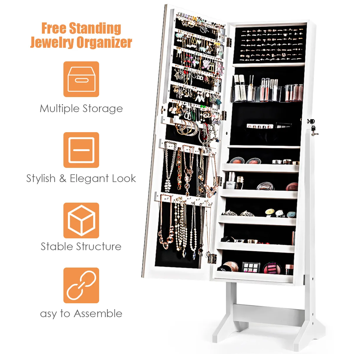 Gemaakt van hoge kwaliteit MDF, deze vrijstaande sieradenkast zorgt voor langdurig gebruik. De sieraden organizer bevat 120 oorbel sleuven en 36 oorbel gaten, 98 ring vakken, 24 ketting haken, 1 armband bar, 3 make-up tool cups, 5 opbergrekken en 1 stofdicht opbergvak. Dankzij de verdeelde opbergruimte met grote capaciteit kunt u al uw collecties in de kast opbergen. En het afsluitbare ontwerp helpt uw sieraden veilig te bewaren. Bovendien biedt de verstelbare spiegel met 4 hoeken u een blik van kop tot teen op uw dressing. Met de mooie houtnerf en stijlvolle uitstraling is het een opvallende aanwinst in uw huis.