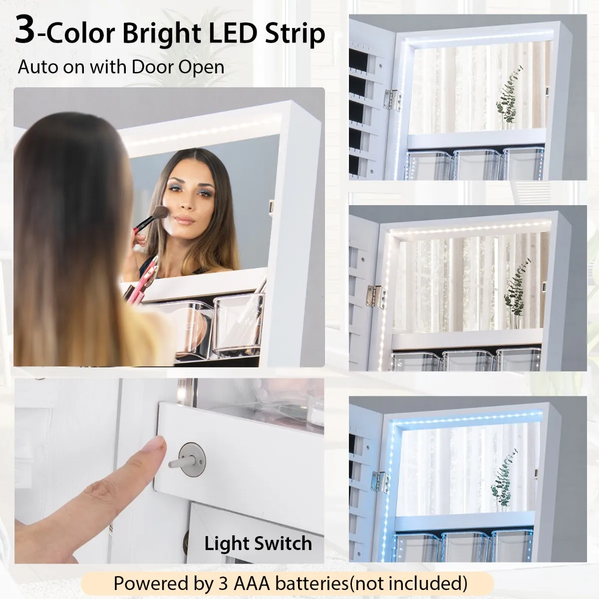 【3 kleuren LED-verlichting en opvouwbare plank】De ingebouwde LED-lichtstrip heeft 3 soorten verlichtingskleuren: blauw licht/warm geel licht/wit + blauw licht (aangedreven door 3 AAA-batterijen, niet inbegrepen). De verlichting gaat automatisch aan als je de deur opent en is eenvoudig te bedienen met de schakelaar. Bovendien is de opvouwbare acrylplank ontworpen om uw ringen te beschermen en kan deze worden geopend om cosmetica op te plaatsen tijdens het maken van make-up.