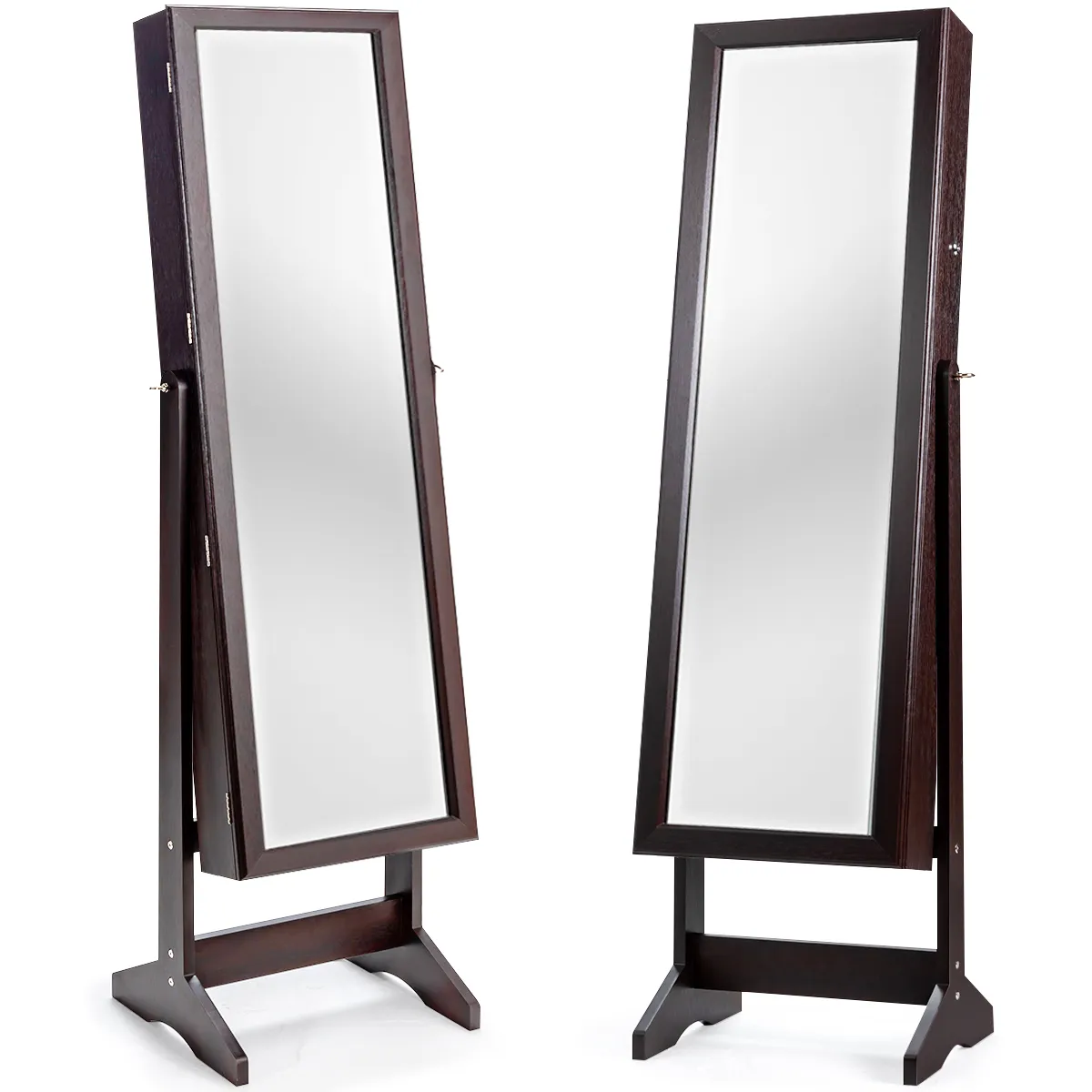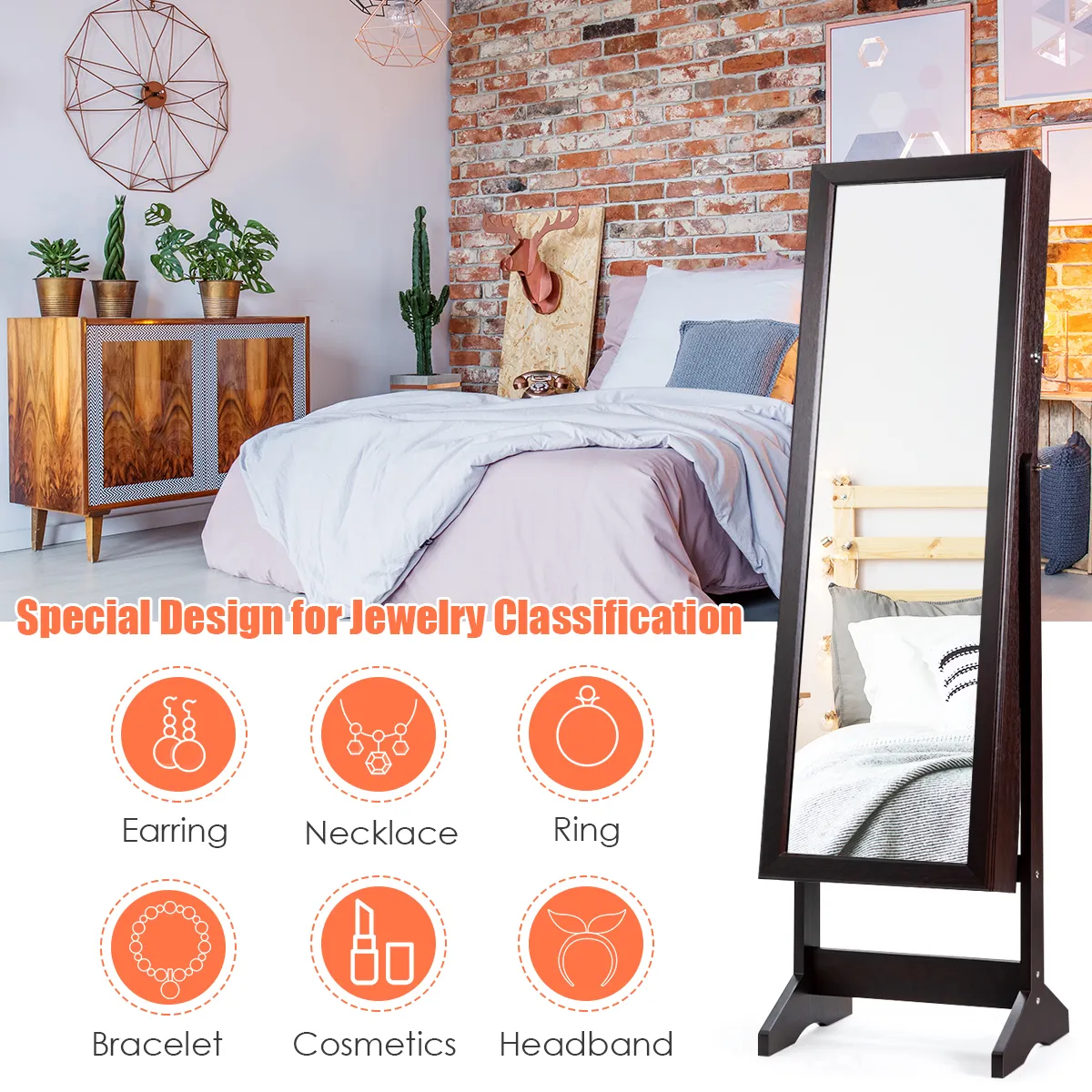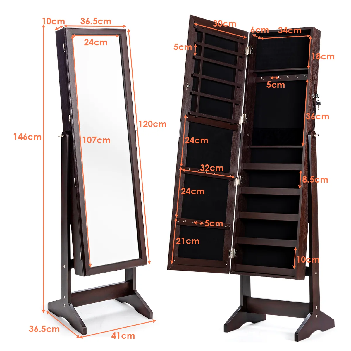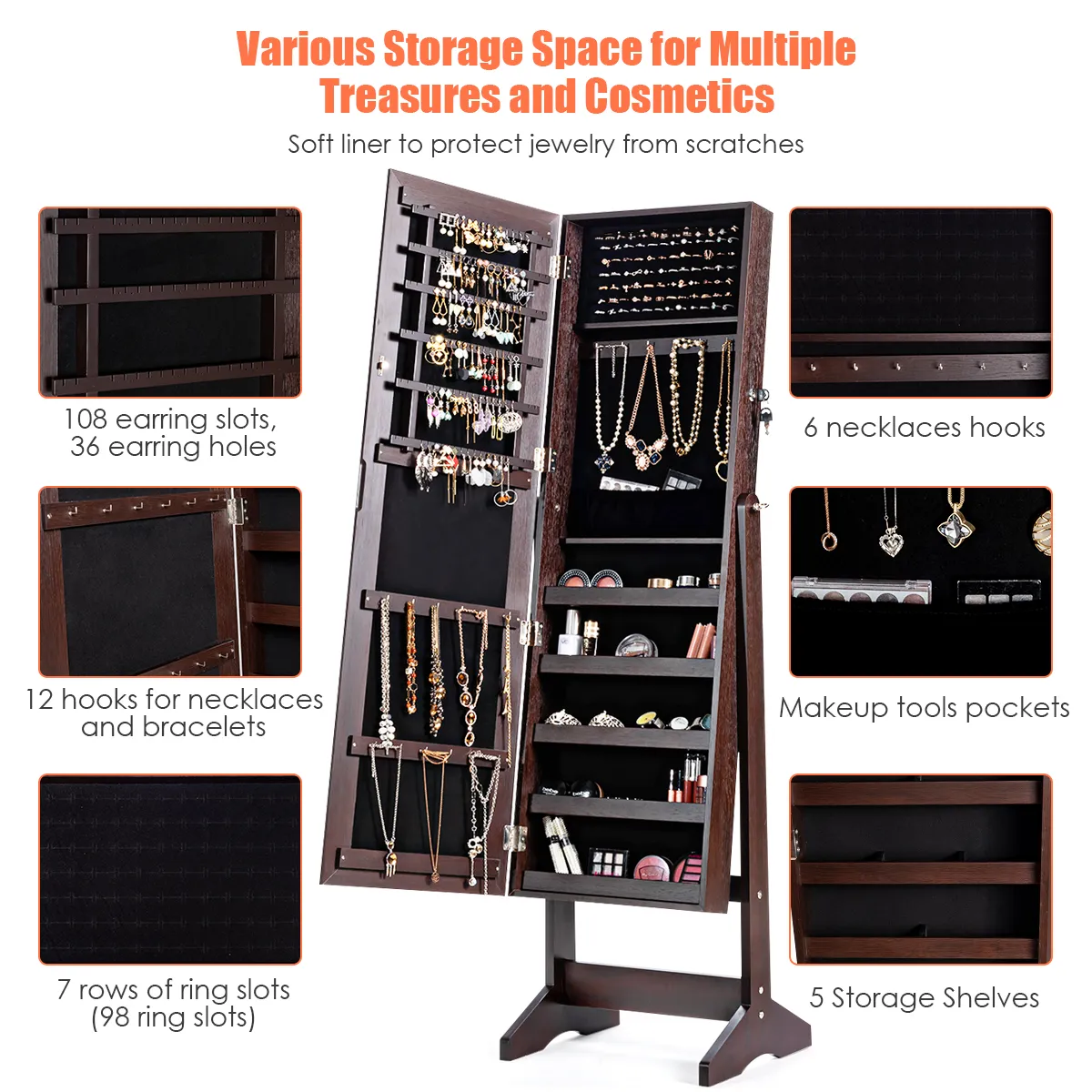 Deze vrijstaande sieradenkast van hoogwaardig MDF garandeert langdurig gebruik. De sieradenorganizer bevat 108 oorbelsleuven en 36 oorbelgaten, 98 ringsleuven, 18 halskettinghaken, 5 opbergplanken en 1 stofdichte tas. De verdeelde opbergruimte met grote inhoud maakt het mogelijk om al je collecties in de kast op te bergen. En het afsluitbare ontwerp helpt om je sieraden veilig te houden. Bovendien biedt de 4-voudig verstelbare totale lichaams spiegel je een uitgebreid zicht op je uiterlijk. Met mooie houtnerf en stijlvolle uitstraling is hij een blikvanger in je huis.