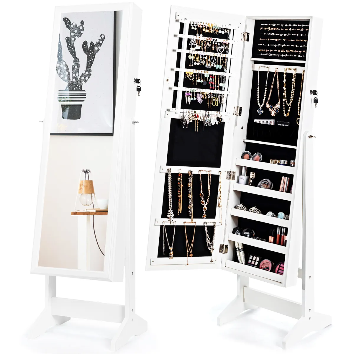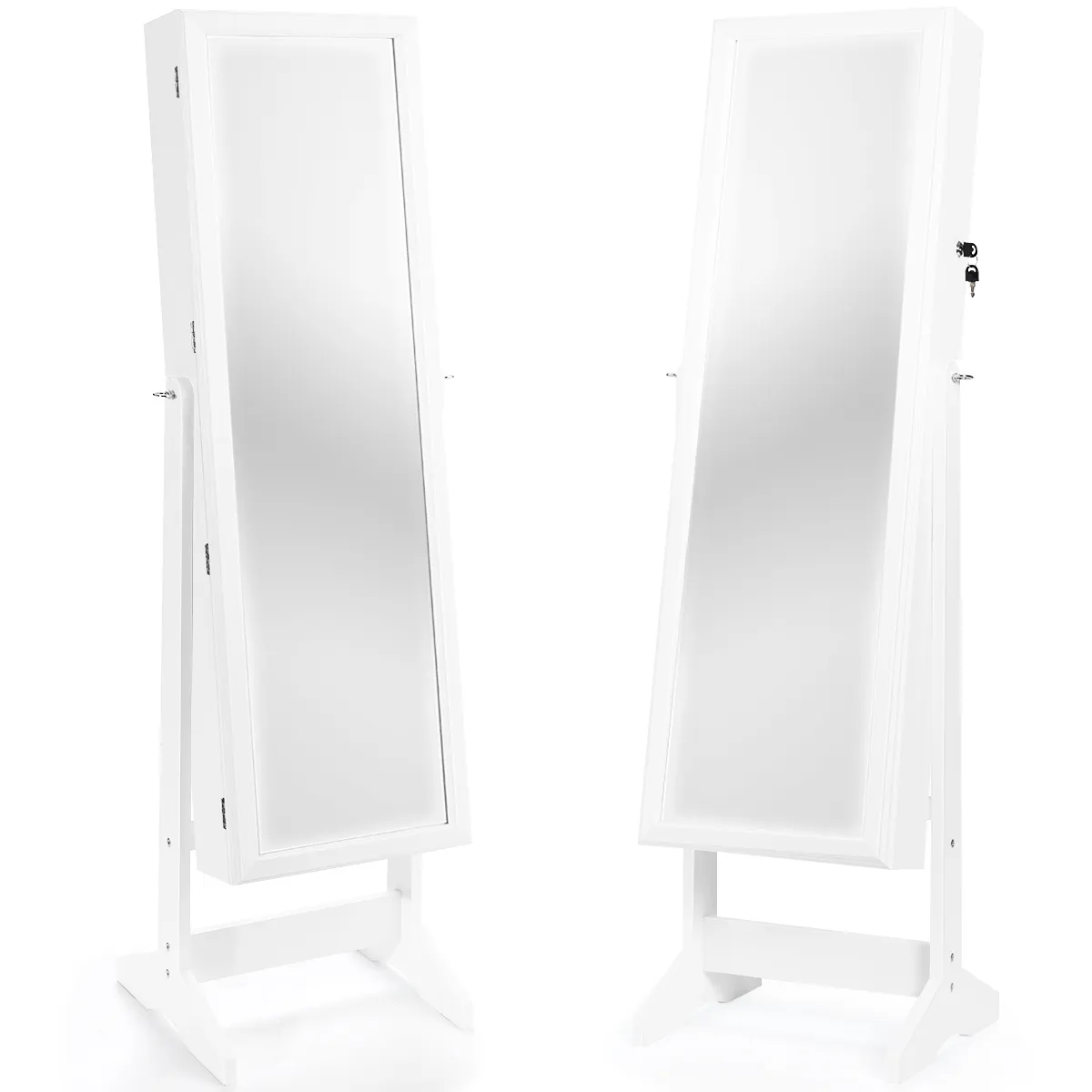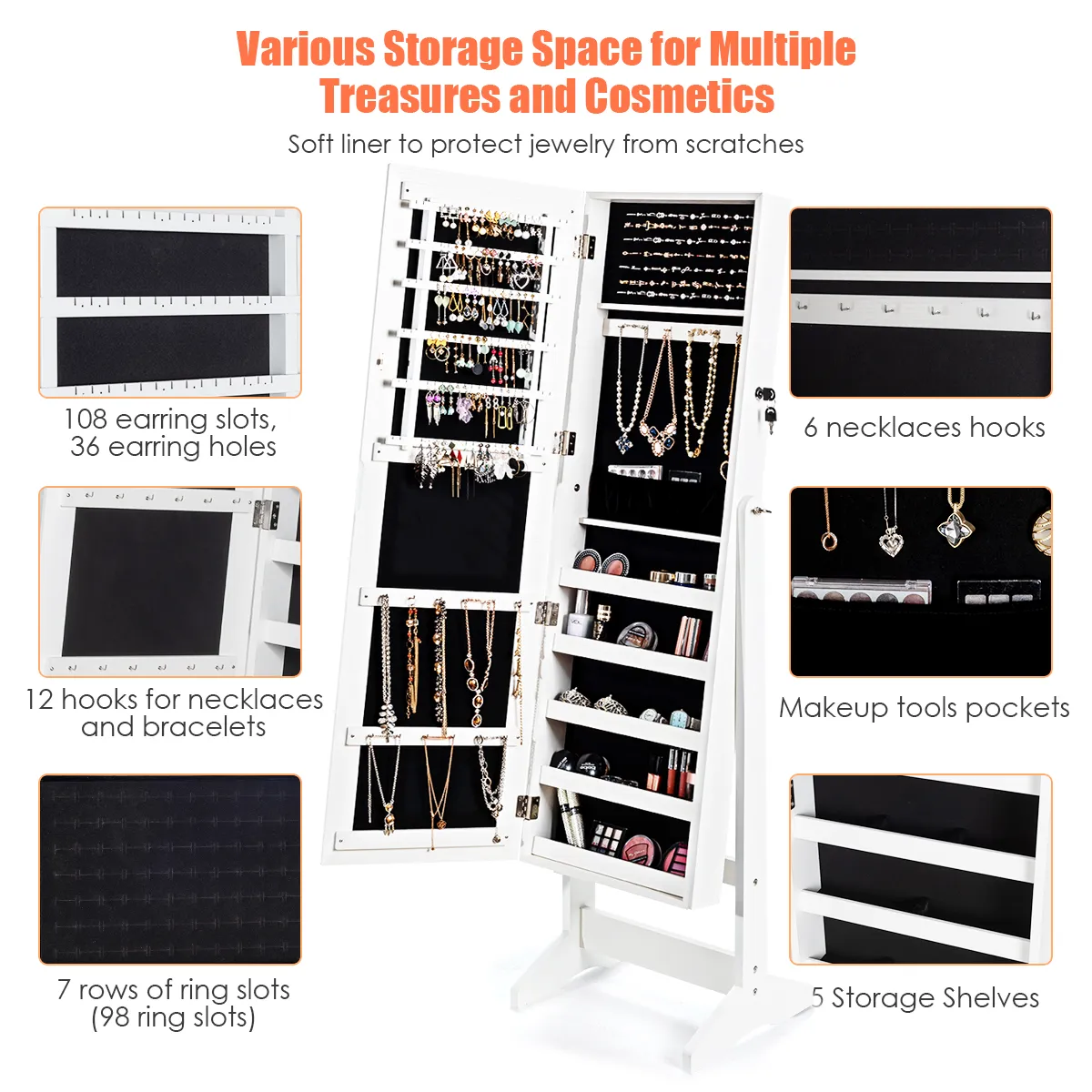 Deze vrijstaande sieradenkast van hoogwaardig MDF garandeert langdurig gebruik. De sieradenorganizer bevat 108 oorbelsleuven en 36 oorbelgaten, 98 ringsleuven, 18 halskettinghaken, 5 opbergplanken en 1 stofdichte tas. De verdeelde opbergruimte met grote inhoud maakt het mogelijk om al je collecties in de kast op te bergen. En het afsluitbare ontwerp helpt om je sieraden veilig te houden. Bovendien biedt de 4-voudig verstelbare totale lichaams spiegel je een uitgebreid zicht op je uiterlijk. Met mooie houtnerf en stijlvolle uitstraling is hij een blikvanger in je huis.