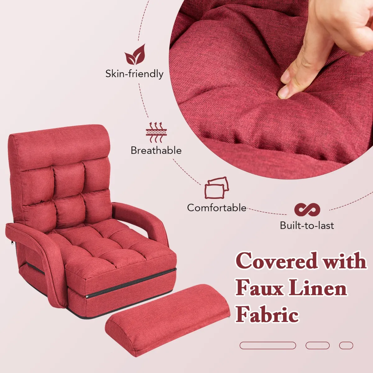 【Verstelbare rugleuning 90° tot 180°】Met vijf verstelbare posities, van 90° tot 180°, is onze luie bank ontworpen om aan uw verschillende behoeften te voldoen. Door de gestroomlijnde vormgeving past de rugleuning van de vloerstoelbank perfect bij uw lichaam, wat rugpijn en baarmoeder halspijn voorkomt. Zelfs als u lang ligt of zit, zult u zich niet moe voelen.