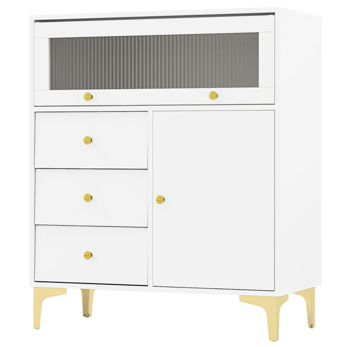 【Kantelbare geribbelde glazen deur】: De kast is voorzien van een kantelbare geribbelde glazen deur voor gemakkelijke toegang. U kunt de deur in de kast schuiven om te pakken wat u nodig hebt en zo ruimte te besparen. Bovendien geeft de geribbelde glazen deur met gouden knop een elegante toets aan uw kamer.