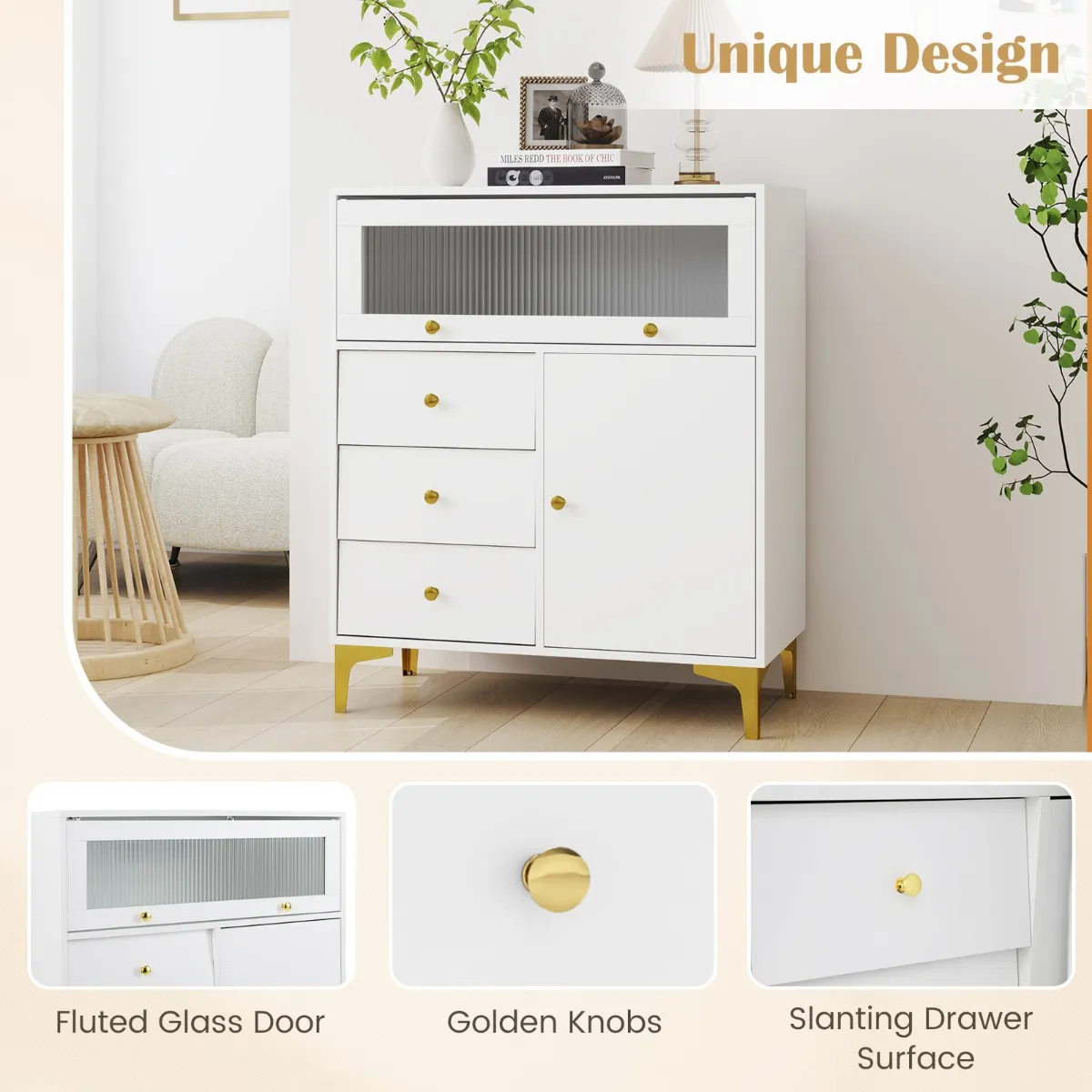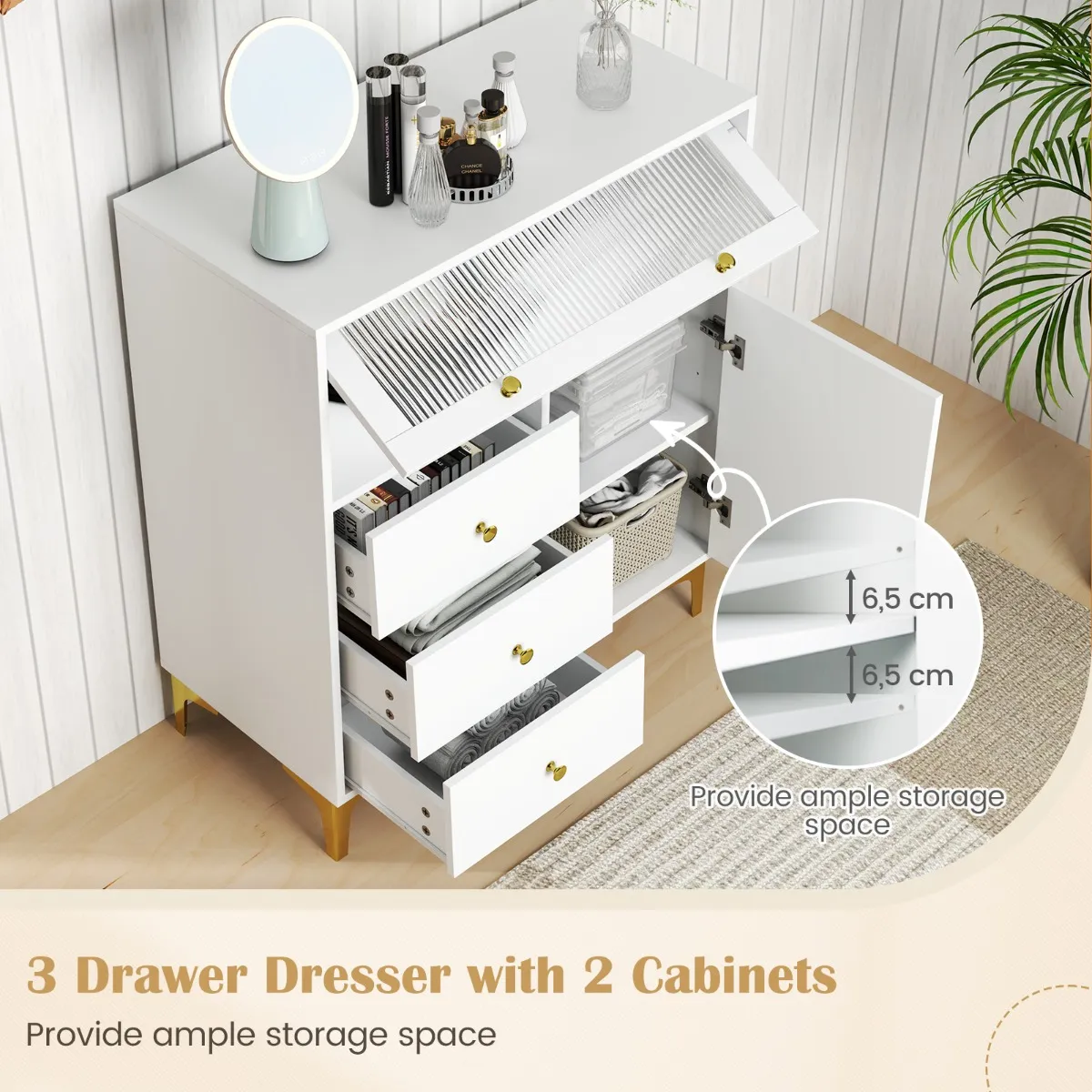 Het is ontworpen met 3 grote lades en 2 deurkastjes om uw spullen in op te bergen. Dankzij de verstelbare plank achter de deur is deze kast geschikt voor spullen van verschillende hoogtes. Dankzij de L-vormige metalen poten en het anti-kantelontwerp blijft de kast stabiel en stevig. Bovendien zorgt de kantelbare glazen deur voor een gemakkelijke toegang. Dankzij de handige handgrepen en metalen geleiders kunt u de lades eenvoudig openen en bij uw spullen. De geribbelde glazen deur en de schuine laden geven uw kamer een elegante uitstraling.