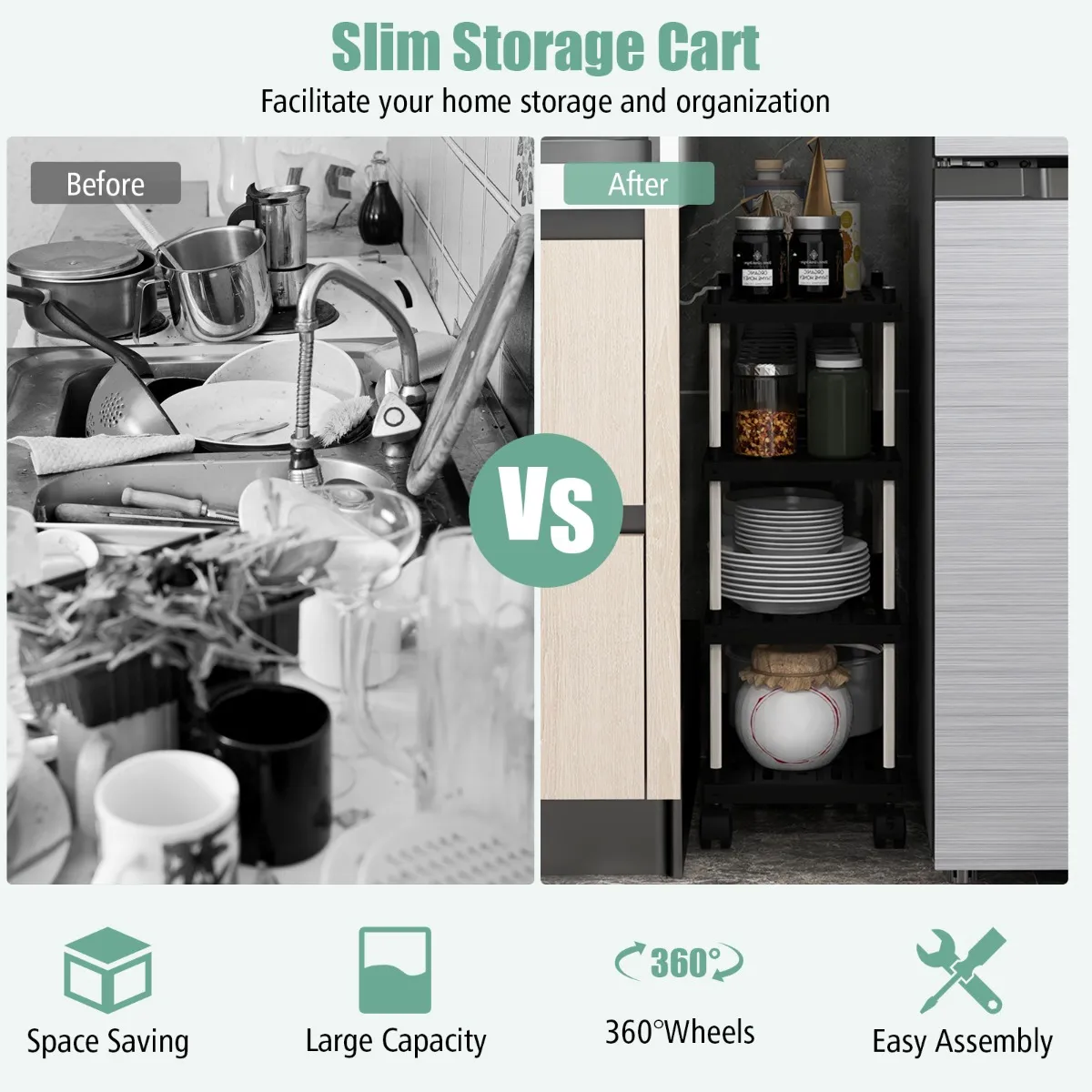 Ruimtebesparend ontwerp: Deze slanke opbergwagen helpt u de opslag en organisatie in uw huis te maximaliseren, met 4 planken in een compact ontwerp. Met afmetingen van 40 x 21 x 59,5 cm (L x B x H) past hij efficiënt in beperkte ruimtes.