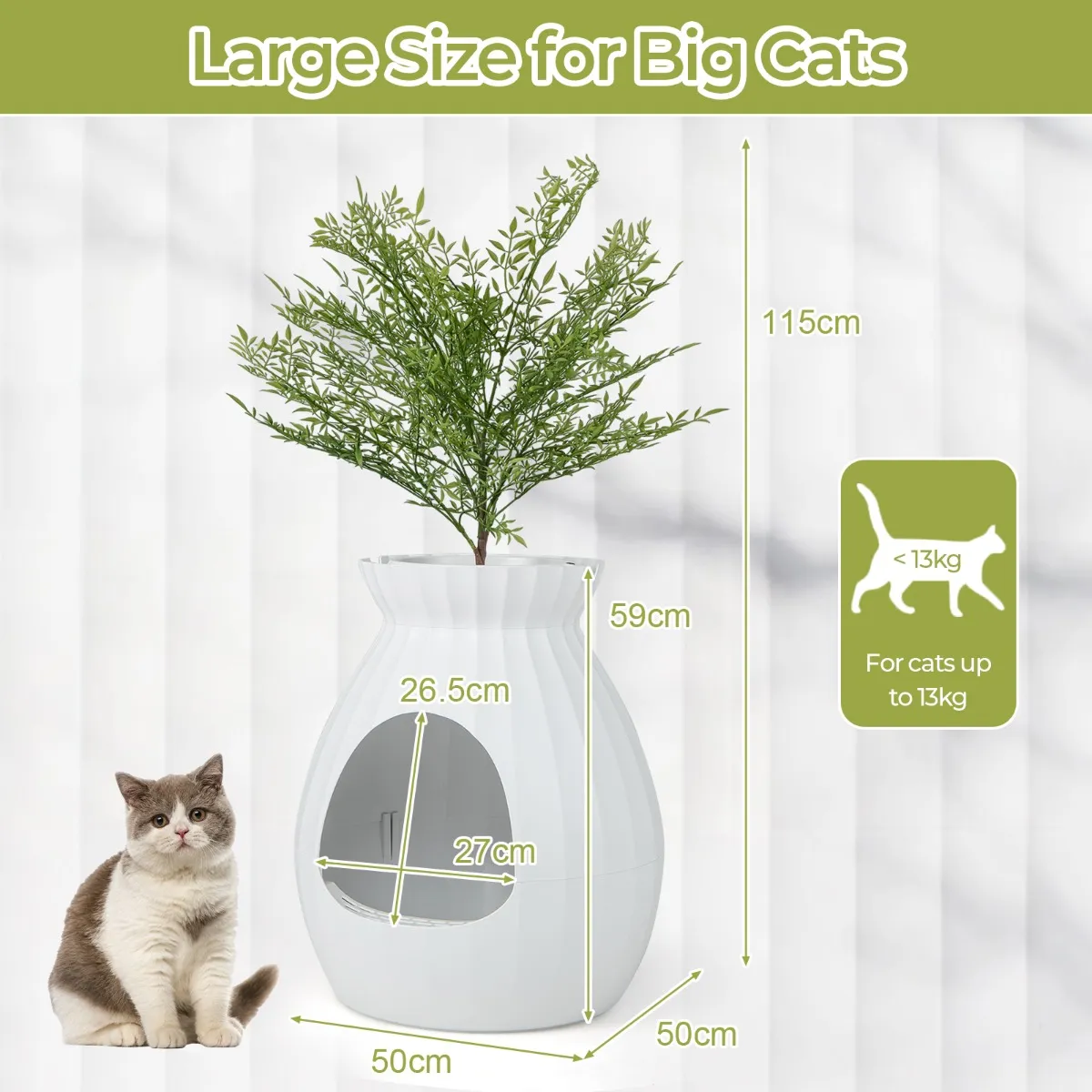 Deze innovatieve kattenbak met zijn elegante bloempotvorm past perfect in elke interieurstijl. Het is versierd met een kunstplant en verschillende kiezelstenen, waardoor uw woonruimte een vleugje groen krijgt. Het beschikt over een geavanceerd elektronisch sterilisatie- en geureliminatiesysteem, waardoor u een aangename omgeving krijgt. De installatie is eenvoudig: sluit gewoon elk onderdeel aan zonder gereedschap. Het deurgordijn creëert een privéruimte en voorkomt geurtjes. En hij is gemaakt van stevig ABS om de tand des tijds te doorstaan.