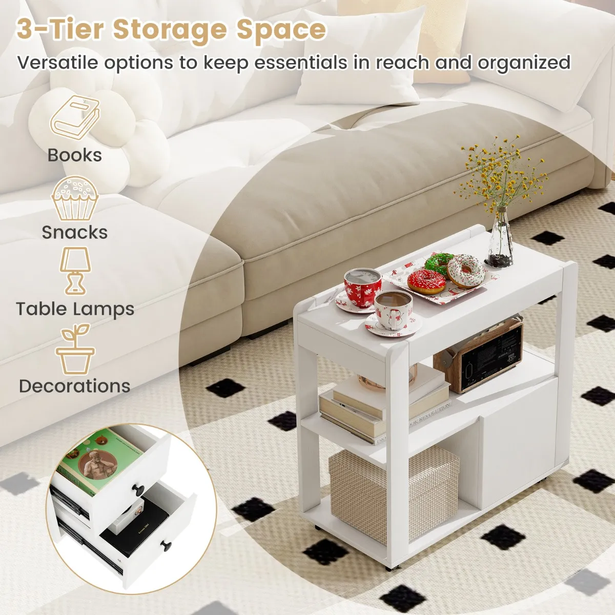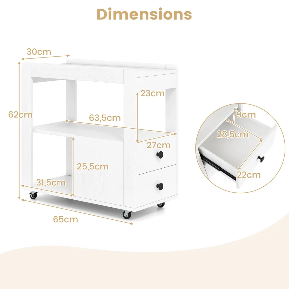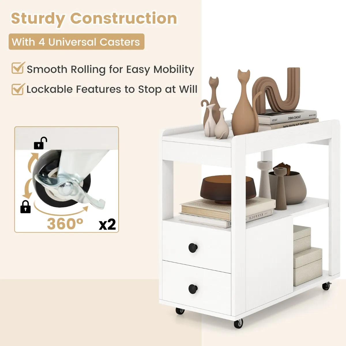 Smalle Bijzettafel Modern Nachtkastje Met 2 Lades En Open Planken Opbergorganizer Met Vergrendelbare Wielen Wit
