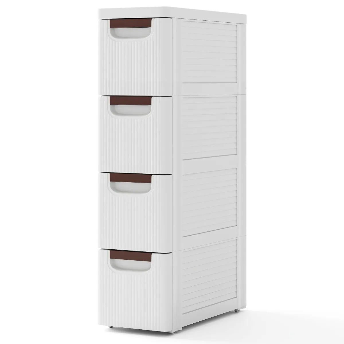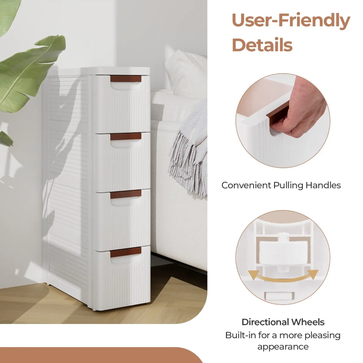 Meerdere laden:Â De opbergkast heeft 4 laden waarmee u verschillende items kunt categoriseren en opslaan. Of het nu gaat om kantoorbenodigdheden, keukengerei, speelgoed, snacks of badartikelen, alles blijft netjes opgeborgen en toch gemakkelijk toegankelijk.