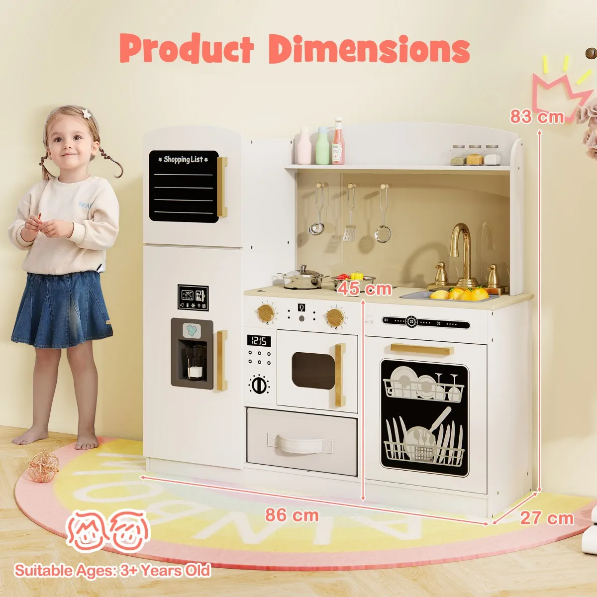 Met een oplichtende magnetron en een speelse ijsmaker brengt deze gesimuleerde speelkeuken een realistisch element in de speeltijd van kinderen. De toevoeging van een zelfgemaakt krijtbord en acrylbord zorgt voor creatieve expressie, terwijl de gootsteen en vaatwasser levensechte keukenscenario’s nabootsen. Deze peuterkeukenset wordt geleverd met accessoires voor een complete ervaring en biedt veel opbergruimte voor organisatie. De peuterkeuken is een perfect cadeau voor kleine chef-koks vanaf 3 jaar en biedt een veilige en inspirerende omgeving voor fantasierijk spel en ontwikkeling.
