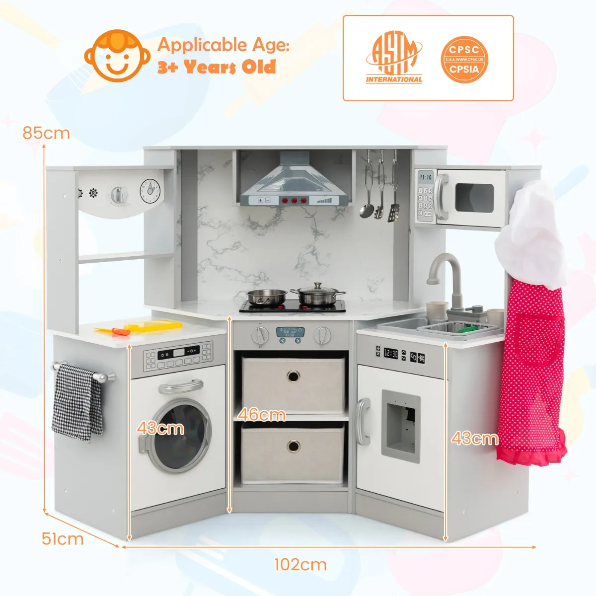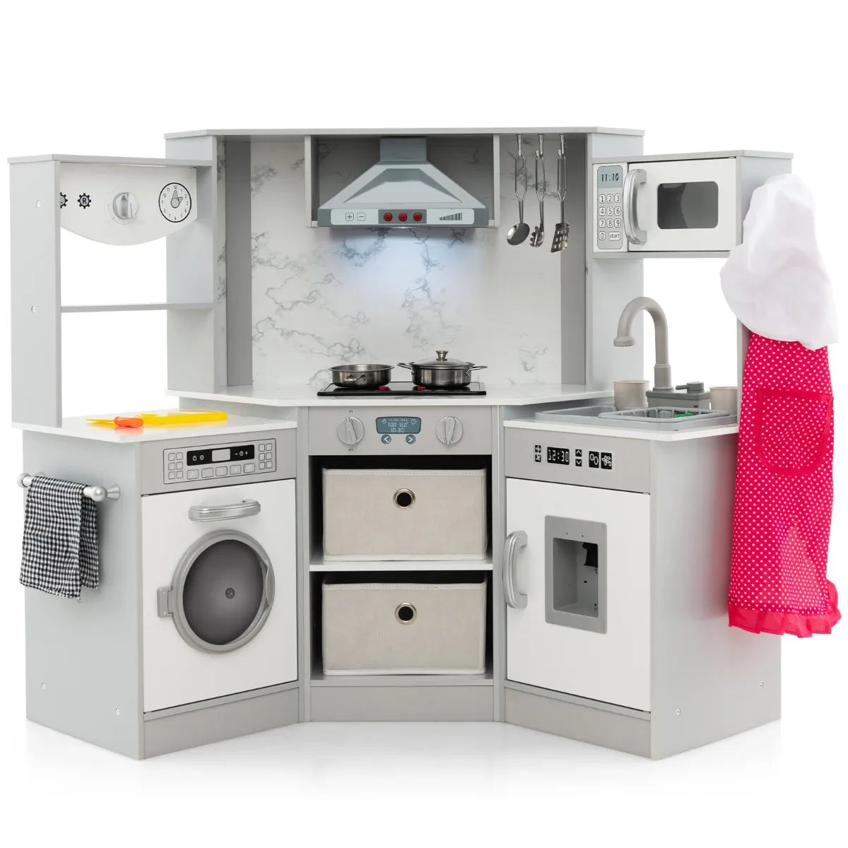 Onze hoekkeukenset met licht en geluid zal kinderen vanaf 3 jaar aanspreken. Het bevat een werkende afzuigkap, magnetron, bereidingsruimte, 2 verlichte fornuizen en 2 draaiknoppen zodat ze kunnen oefenen met koken. Het gesloten watercirculatiesysteem van de kraan en de gootsteen zorgt ervoor dat ze plezier kunnen hebben en de waterdispenser en wasmachine zorgen voor meer interactief plezier. Complete accessoires en opbergruimte helpen hen een goede organisatiegewoonte te ontwikkelen.
