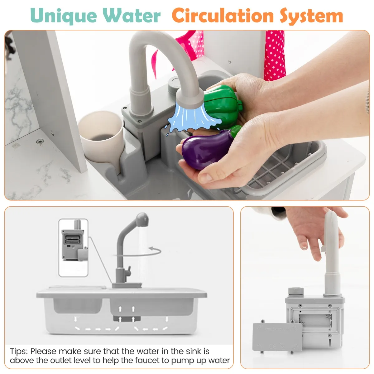 Uniek watercirculatiesysteem: Onze kinderhoekkeuken is voorzien van een kraan en gootsteen met een gesloten watercirculatiesysteem, zodat kinderen kunnen doen alsof ze groenten of fruit wassen. Tips: Zorg ervoor dat het water in de gootsteen zich boven het uitlaatniveau bevindt, zodat de kraan water kan pompen. Er zijn 2 AAA-batterijen nodig, deze zijn niet inbegrepen.