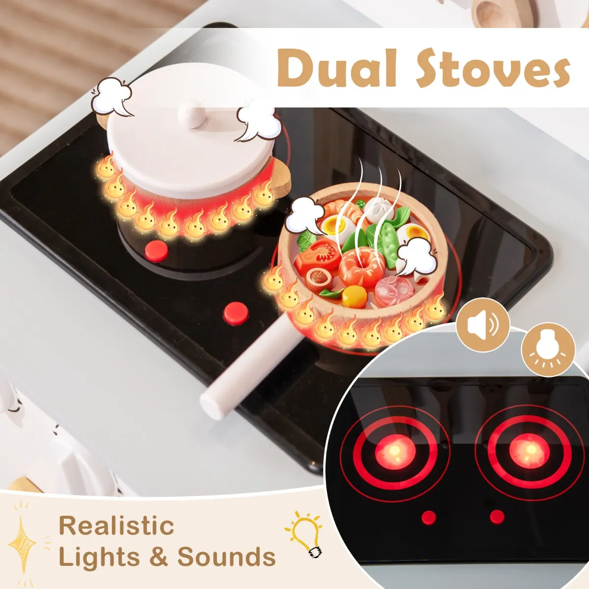 【Realistische lichten en geluiden】: Deze houten speelkeuken heeft 2 fornuizen met realistische licht- en geluidseffecten, plus draaiende knoppen die authentieke ‘klik’-geluiden maken. Deze functies creëren een meeslepende keukenomgeving die de kleintjes zal boeien door middel van boeiend zintuiglijk spel.