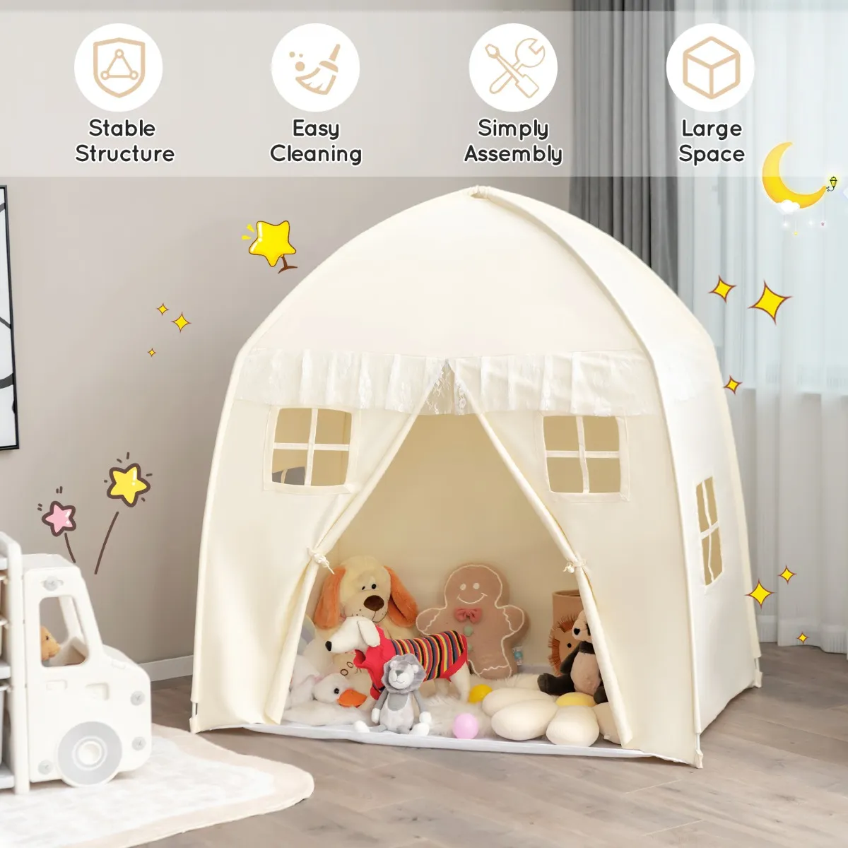 Dit schattige en ruime speelhuis biedt een comfortabele ruimte voor uw kleintjes. Kinderen kunnen hun vriendjes vermaken, spelen en rusten in de tent. Plus, met een draagbaar ontwerp en handige opbergtas, is deze kinderspeeltent ook ideaal voor picknickactiviteiten buitenshuis. Hij is gemakkelijk in elkaar te zetten, op te vouwen en op te bergen. Het belangrijkste is dat het stevige glasvezelframe omwikkeld met zachte katoenen stof niet alleen uitstekende ondersteuning biedt, maar ook de tere huid van het kind beschermt. De antislipmat voorkomt effectief dat de hut wegglijdt. U kunt de tent ook wassen om hem schoon te houden.