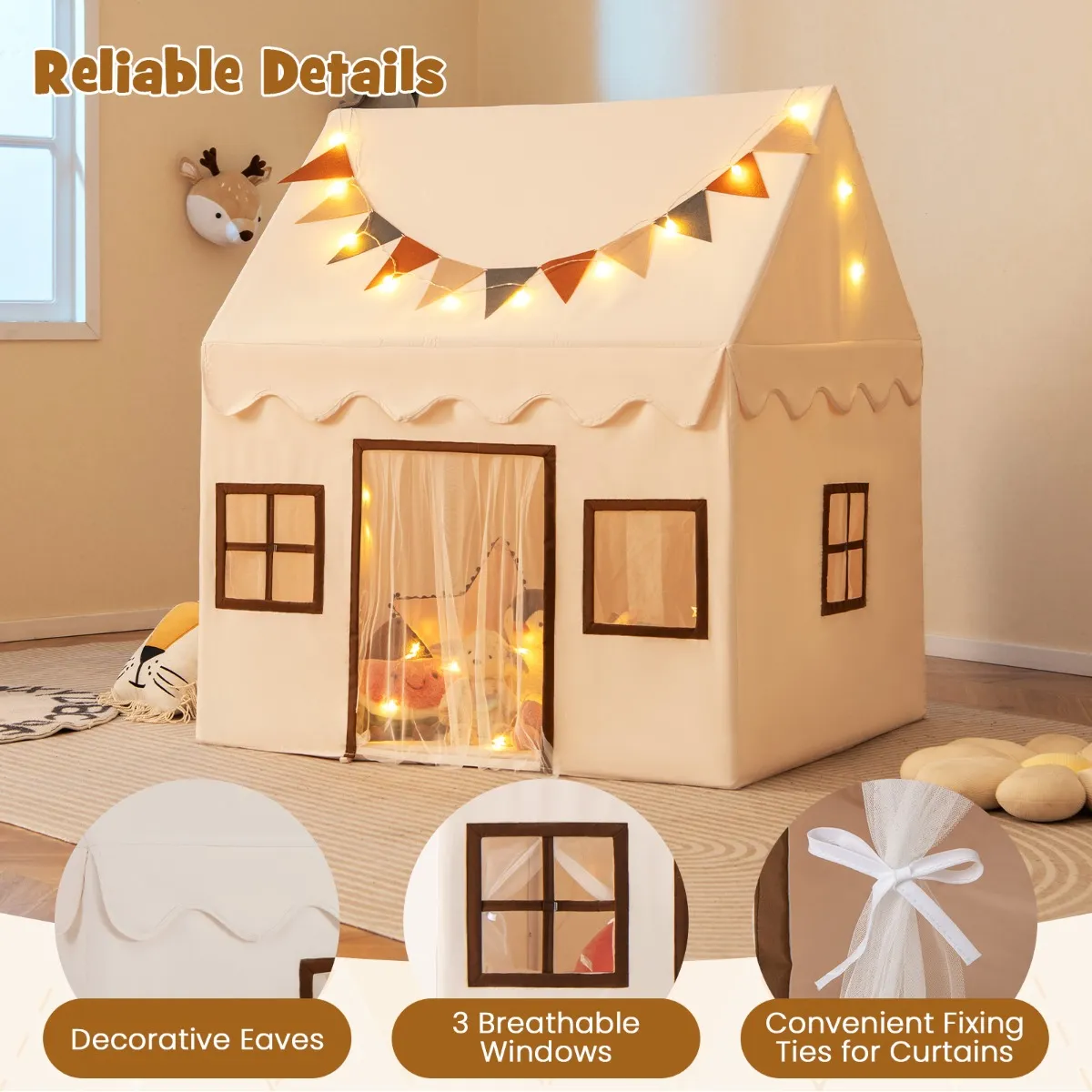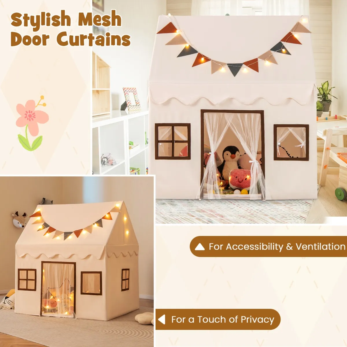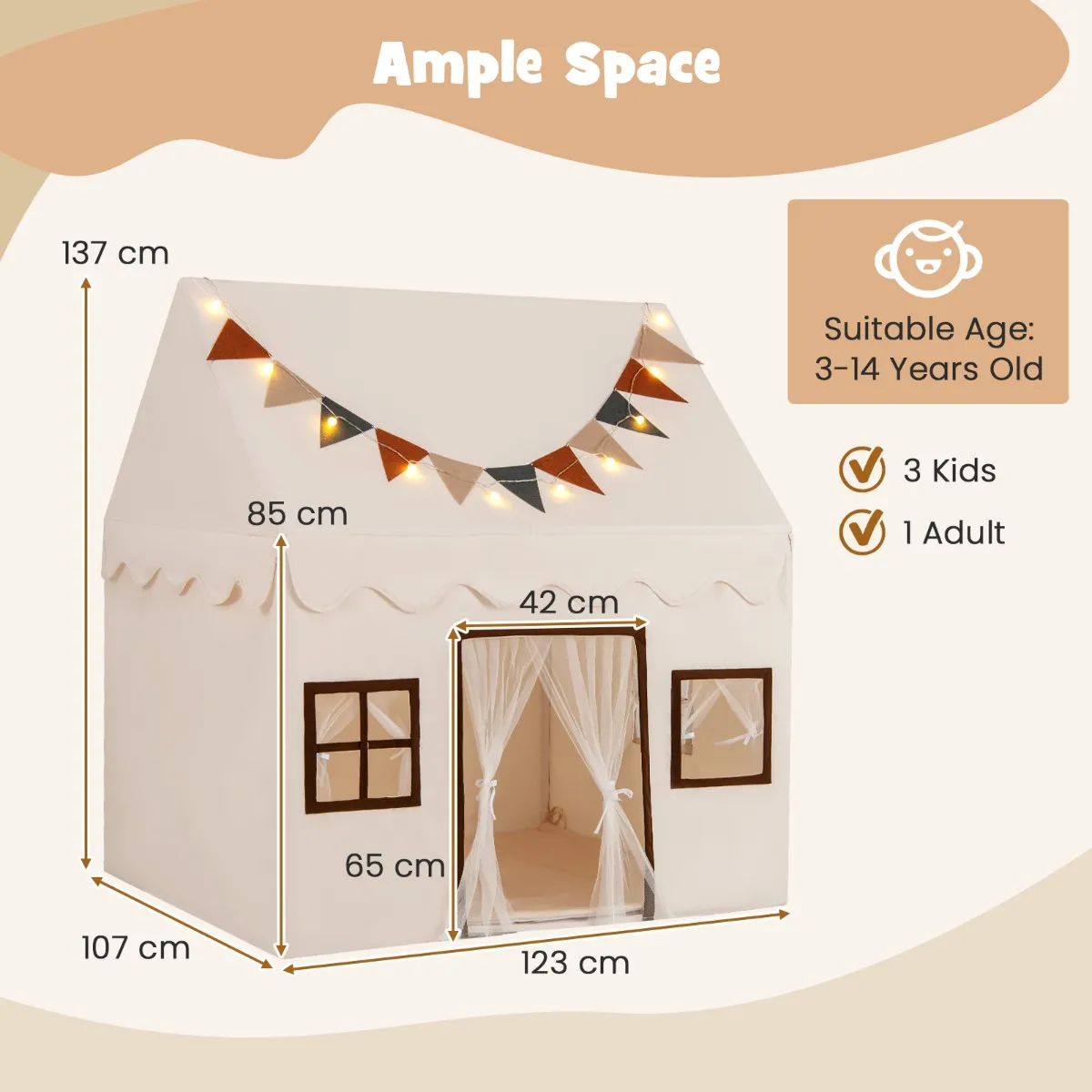 【Versier het kindergedeelte】: De cottage-stijl tent, met zijn schattige ramen en golvende dakranden, zal jonge geesten aanspreken. Hij is ook uitgerust met kleurrijke vlaggen en lichtjes, waardoor hij op een heldere dag een charmante aanwinst is voor elke kinderkamer, speelkamer of buitenspeelruimte.