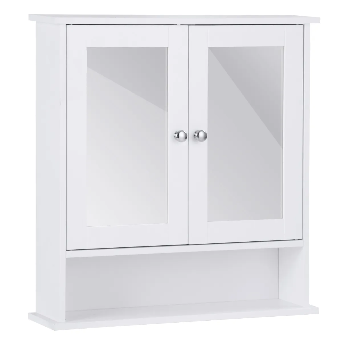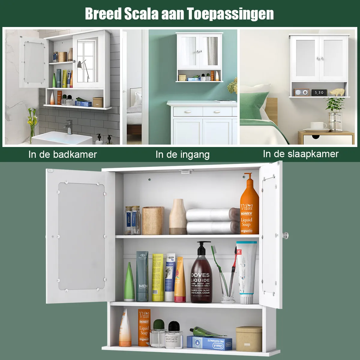 Met een open kast en grote binnen ruimte kan deze kast veel spullen opbergen en organiseren. De binnenste verstelbare plank voldoet aan uw verschillende behoeften op het gebied van opslag. Dankzij de magnetische deurvanger kunnen de deuren goed gesloten worden en worden uw spullen beter beschermd. Voor uw gemak hebben ze allebei een spiegel voor dagelijks gebruik. Bovendien zijn het MDF en het gebruikte beslag premium, waterbestendig en duurzaam om lang mee te gaan.