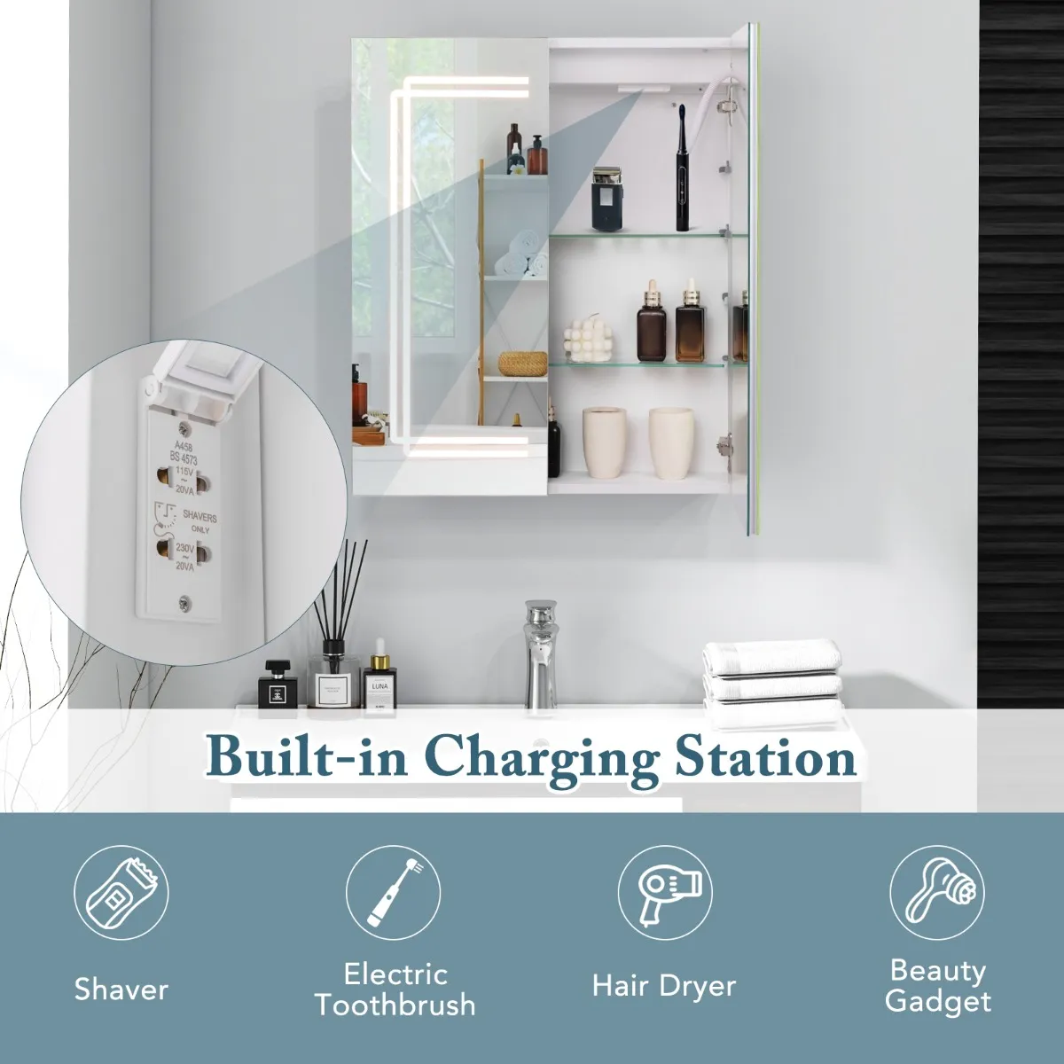 【Praktisch ingebouwd laadstation】: De led-badkamerkast beschikt over 2 geïntegreerde stopcontacten voor het opladen van belangrijke badkamerapparaten. Of het nu gaat om scheerapparaten, elektrische tandenborstel, schoonheidsapparaten of haardrogers, deze spiegelkast zorgt ervoor dat je apparaten altijd opgeladen en klaar voor gebruik zijn.