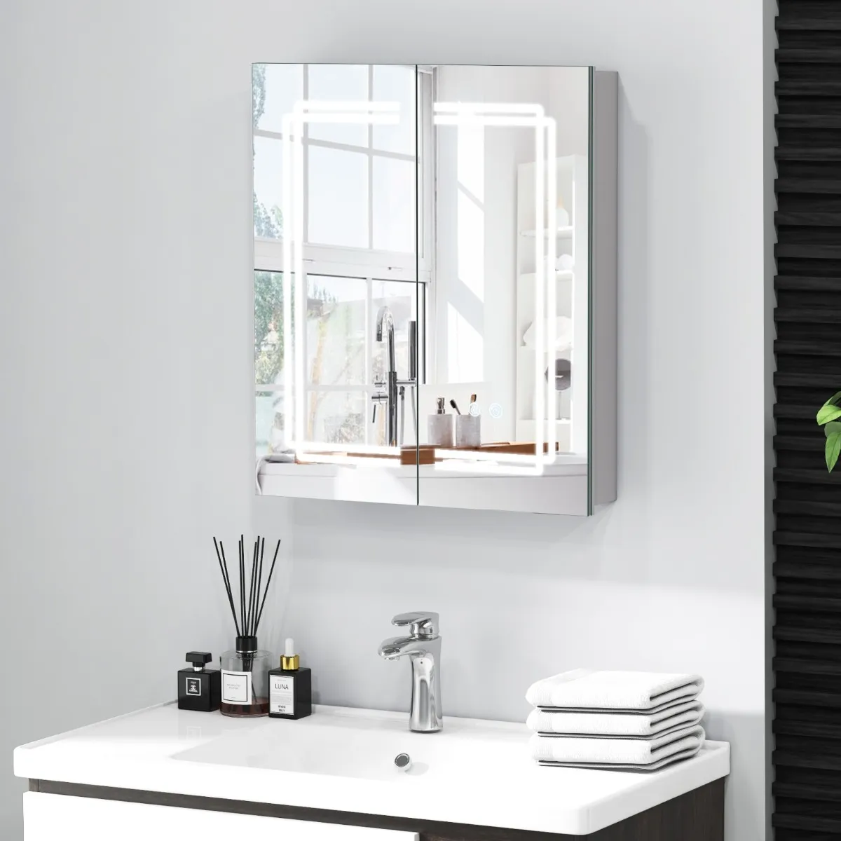 【Veelzijdige verlichtingsopties】: Onze led-verlichte spiegelkast biedt verstelbare kleur- en helderheidsinstellingen. Wissel met slechts een korte aanraking tussen 3000 K warm licht, 4500 K natuurlijk licht of 6000 K wit licht en pas de helderheid traploos van 5% tot 100% aan met een lange druk aan.