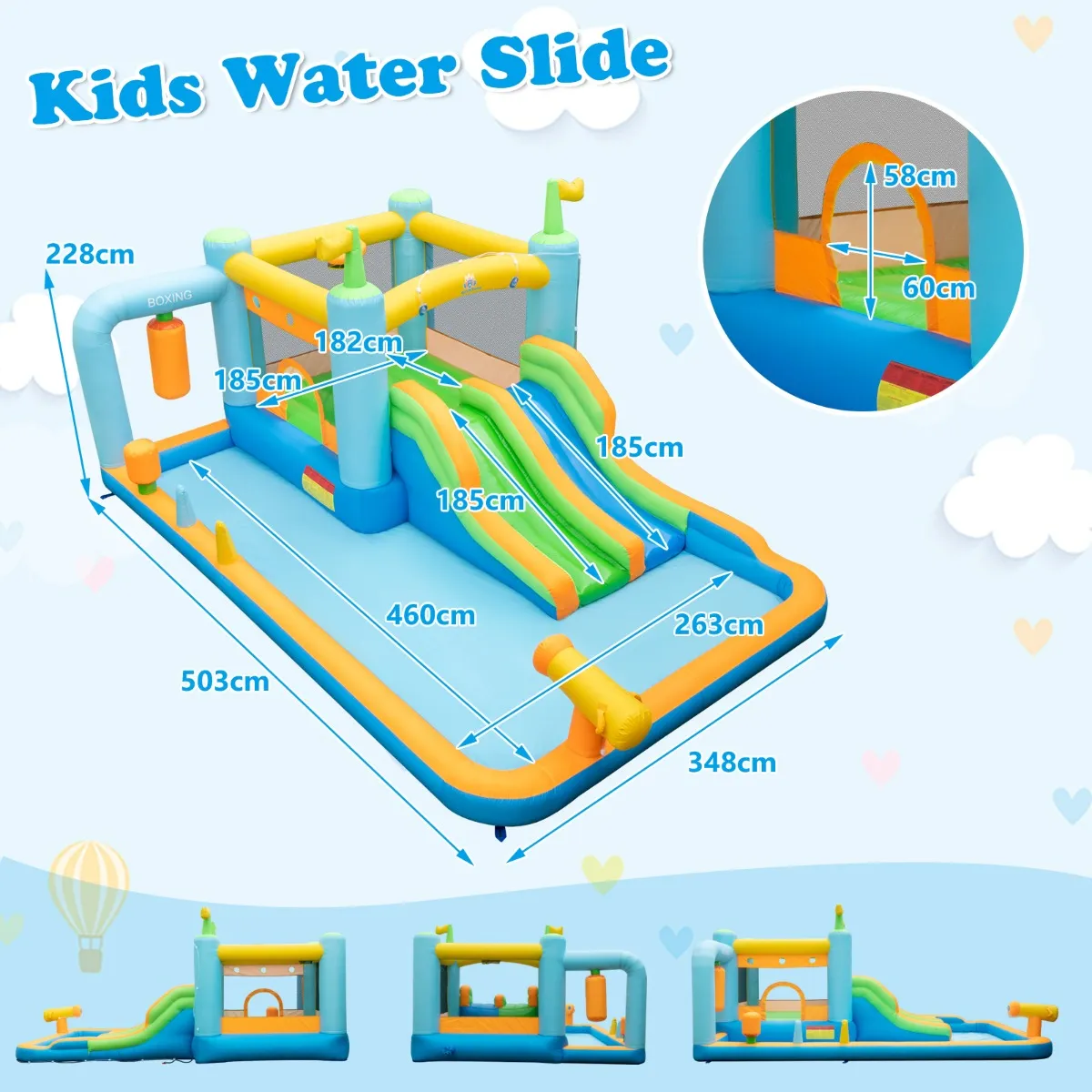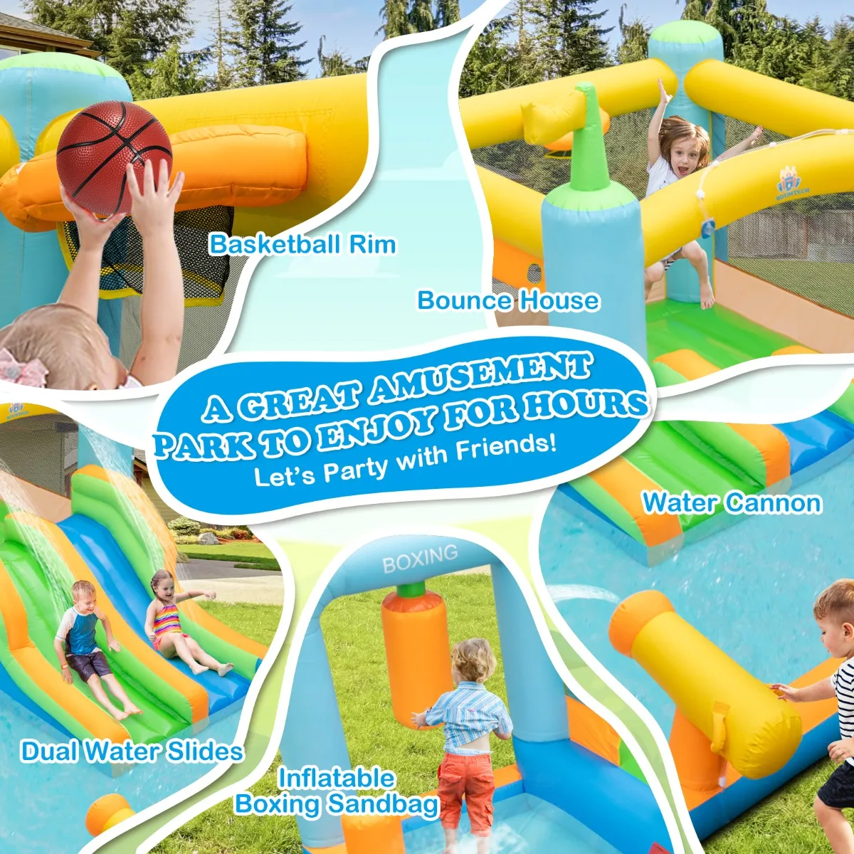 Het waterpark is uitgerust met dubbel naadloze naden en bestaat uit pvc-gecoat Oxford-weefsel met hoge sterkte en betere duurzaamheid. Daarbij beschikt hij over elastische netwanden om kinderen tegen vallen te beschermen. Het springkasteel omvat ook een springgedeelte waarin de kinderen kunnen springen en plezier kunnen hebben met de basketbalkorf. In het grote spuitbad kunnen kinderen een interessante watergevecht starten en het waterkanon gebruiken. Met opblaasbare bokszandzak wordt het springkasteel een opblaasbare bokswereld die aan de fantasie van de kinderen voldoet. Bovendien wordt het geleverd met een complete accessoireset, inclusief haringen, een reparatieset en een draagtas. De ventilator is echter niet inbegrepen en het aanbevolen vermogen bedraagt 680-750 W.