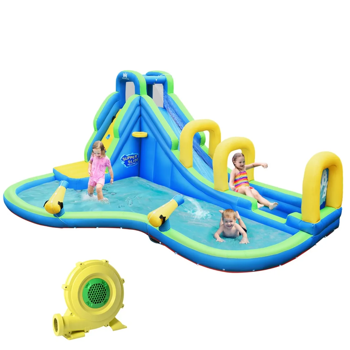 Vergezelt u gedurende uw hele kindertijd! Dankzij de vervaardiging uit hoogwaardige oxford stof is deze waterglijbaan en springkasteel slijtvast en uiterst robuust. Het biedt kinderen verschillende speelruimtes waarmee je talloze leuke activiteiten kunt doen, zoals een waterglijbaan, klimmuur, ingebouwde basketbalring, enz. Op warme zomerdagen kunnen uw kinderen genieten van het grote pierenbad en afkoelen met de waterkanonnen. De beschermende gaaswand garandeert bovendien de veiligheid van uw kinderen en zorgt tegelijkertijd voor een goede ventilatie.