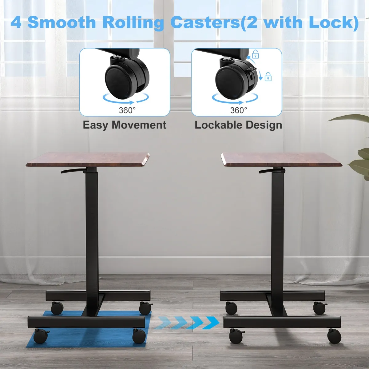 【Eenvoudige beweging en vergrendelbaar ontwerp】: Uitgerust met 4 gladde wielen (2 met vergrendeling) kan het rollende laptopbureau gemakkelijk worden verplaatst en op een willekeurige plaats veilig worden gestopt. Bovendien kun je dit staande bureau comfortabel onder je bank of bed schuiven.