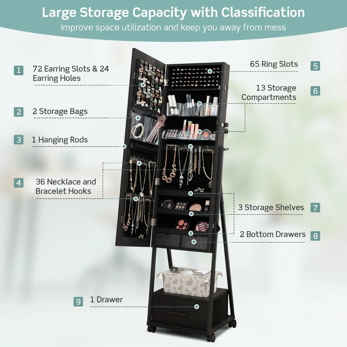 Vergrendelbare wielen en kastdeur: Deze vrijstaande juwelenkast is uitgerust met 4 universele vergrendelbare wielen, waardoor je hem gemakkelijk van kamer naar kamer kunt verplaatsen en de juwelenkast stevig verankerd blijft aan de vloer. Bovendien is de kastdeur voorzien van een slot en worden er 2 sleutels meegeleverd.