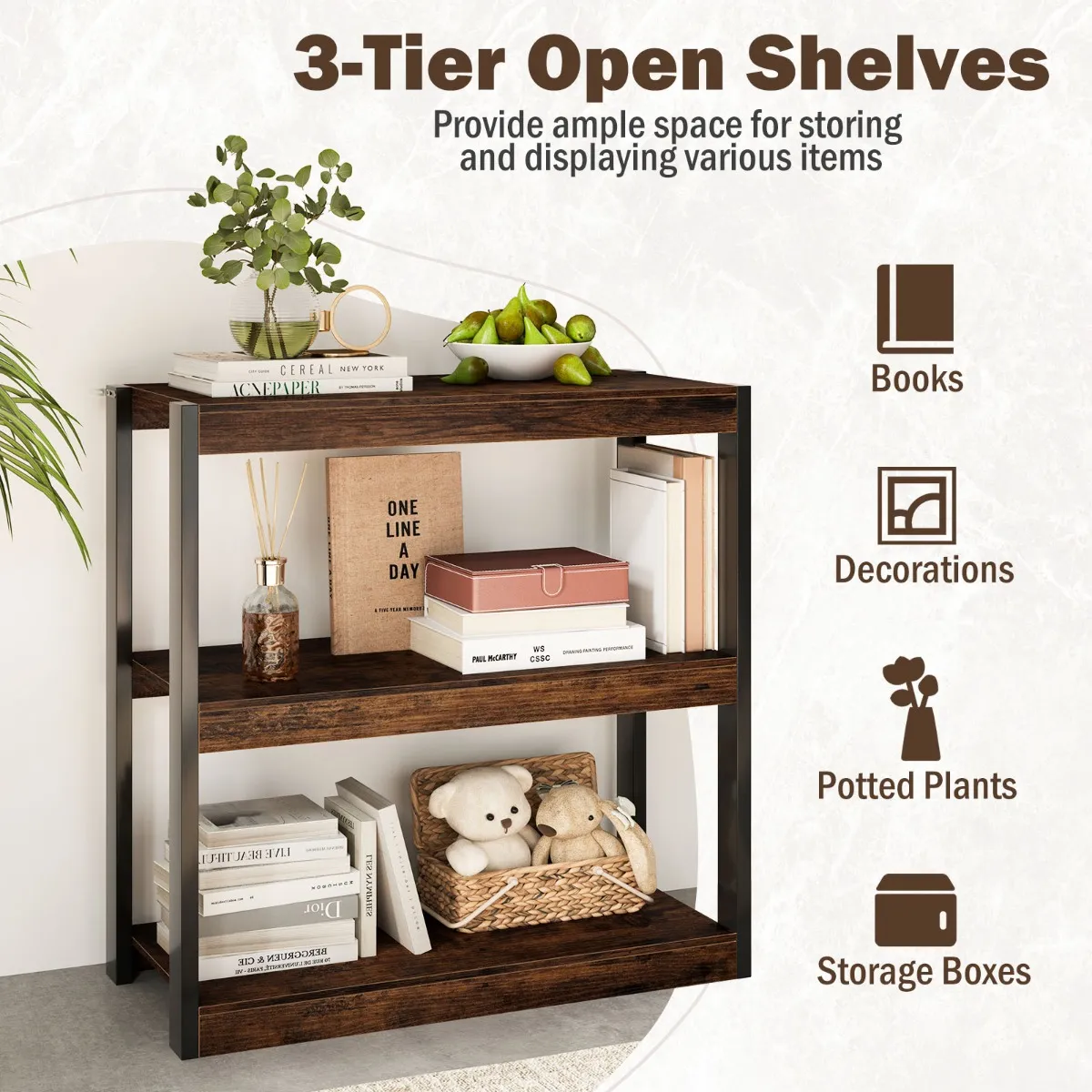 【3 legplanken】: Het opbergrek beschikt over 3 planken voor boeken, foto’s, schrijfwaren, planten en decoraties. Het naadloze ontwerp maakt de organisatie moeiteloos en verandert je woonkamer in een nette woonomgeving.