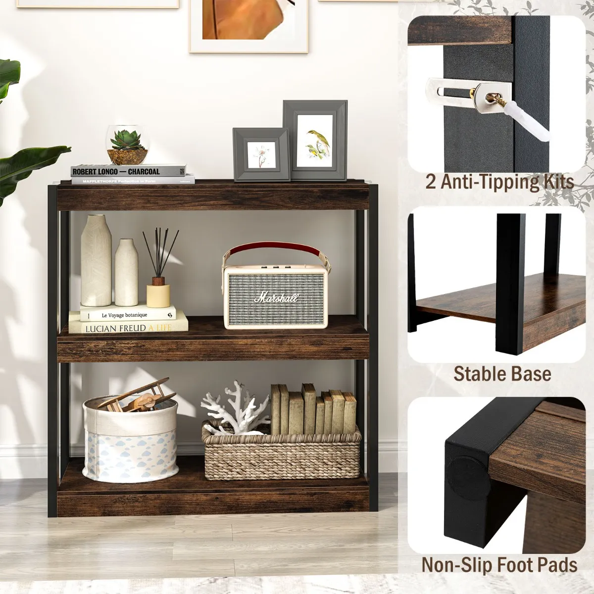 Het robuuste boekenkast wordt geleverd met 3 legplanken voor boeken, foto’s en decoraties. Dankzij de duurzame houten constructie kan het boekenrek tot 80/120 kg dragen. Uitgerust met twee kantelbeveiligingssets zorgt het voor stabiliteit en veiligheid bij veelzijdig gebruik als plantenstandaard of keukenrek. Het naadloos overkoepelende ontwerp maakt een eenvoudige organisatie en een elegante uitstraling mogelijk, met schroefgatafdekkingen voor een uniform uitziend oppervlak. Het splintervrije materiaal vereenvoudigt onderhoud en reiniging.