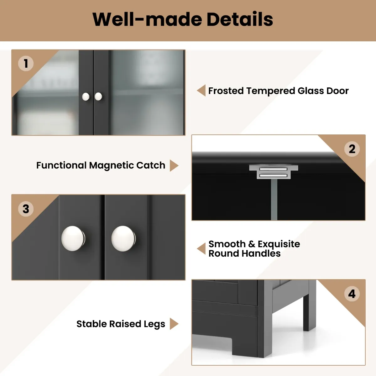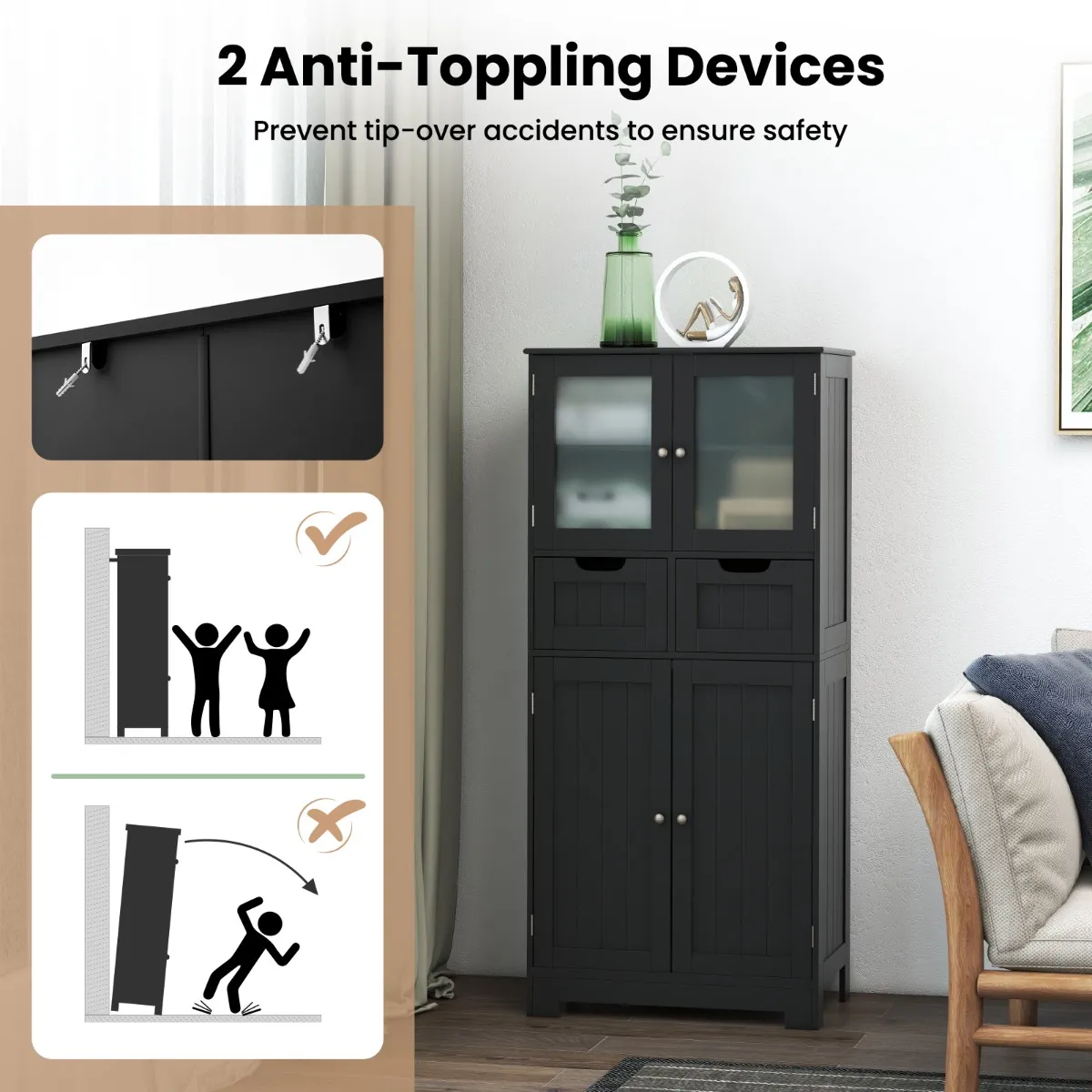 Uitgerust met een grote plank, een bovenkast van 2 niveaus met deuren van gehard glas, 2 lades en een onderkast van 2 niveaus met deuren, heeft deze vrijstaande kast voldoende opbergruimte gesorteerd voor verschillende items, zoals toiletartikelen, handwerk, boeken, servies, enzovoort. We willen erop wijzen dat de planken in 3 verschillende standen kunnen worden gezet of verwijderd, zodat je spullen van verschillende hoogtes kunt opbergen. Gemaakt van dik en duurzaam MDF, garanderen we een product dat heel lang meegaat. Bovendien is het uitgerust met 2 anti-kantelvoorzieningen om de veiligheid van jou en je gezin te beschermen. Met zijn moderne look en multifunctionele ontwerp is deze 4-deurs staande kast geschikt voor verschillende gelegenheden, zoals badkamer, woonkamer, keuken, enz.