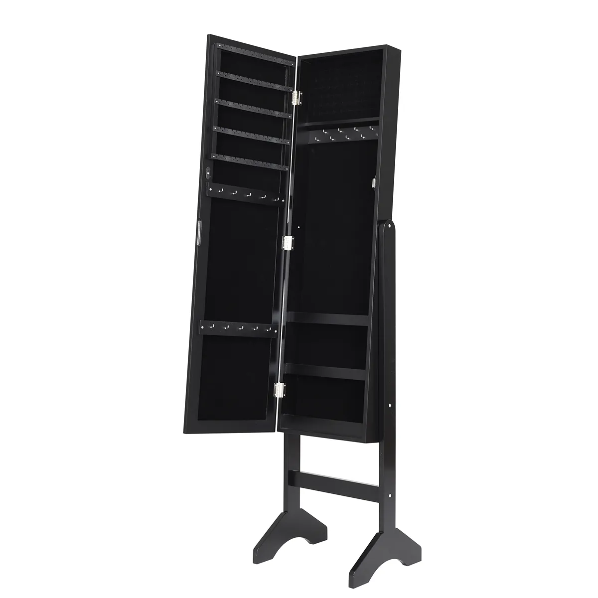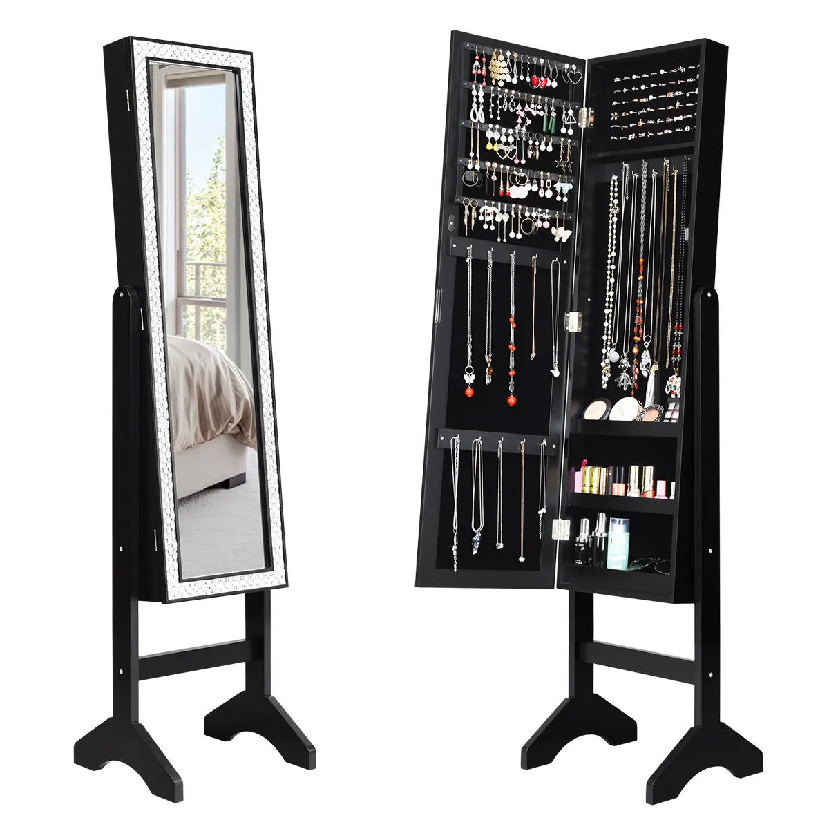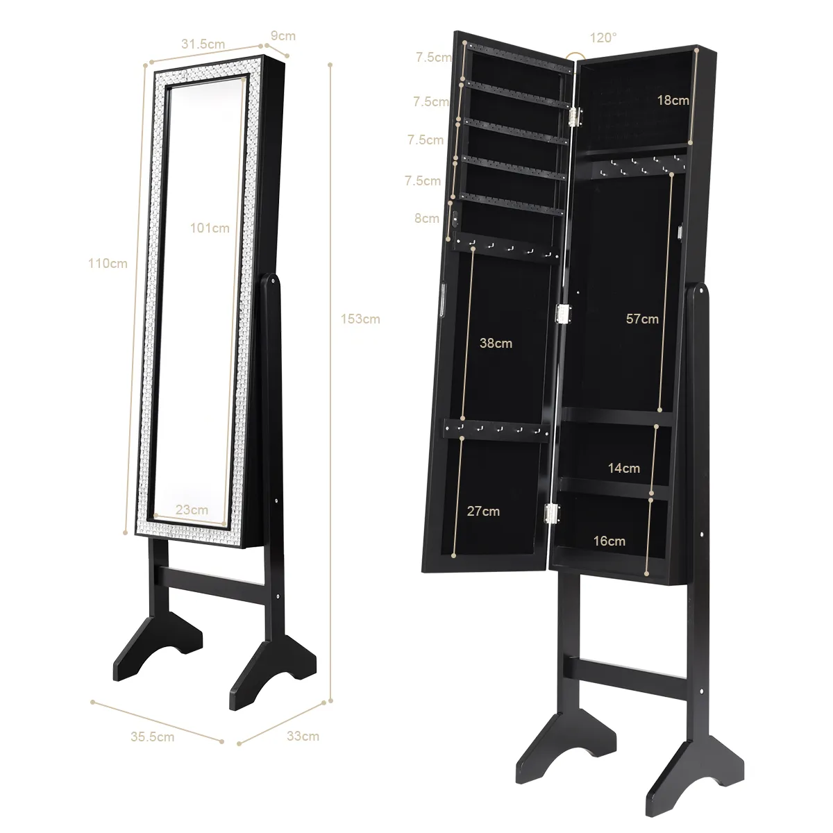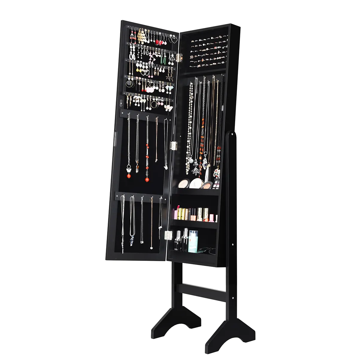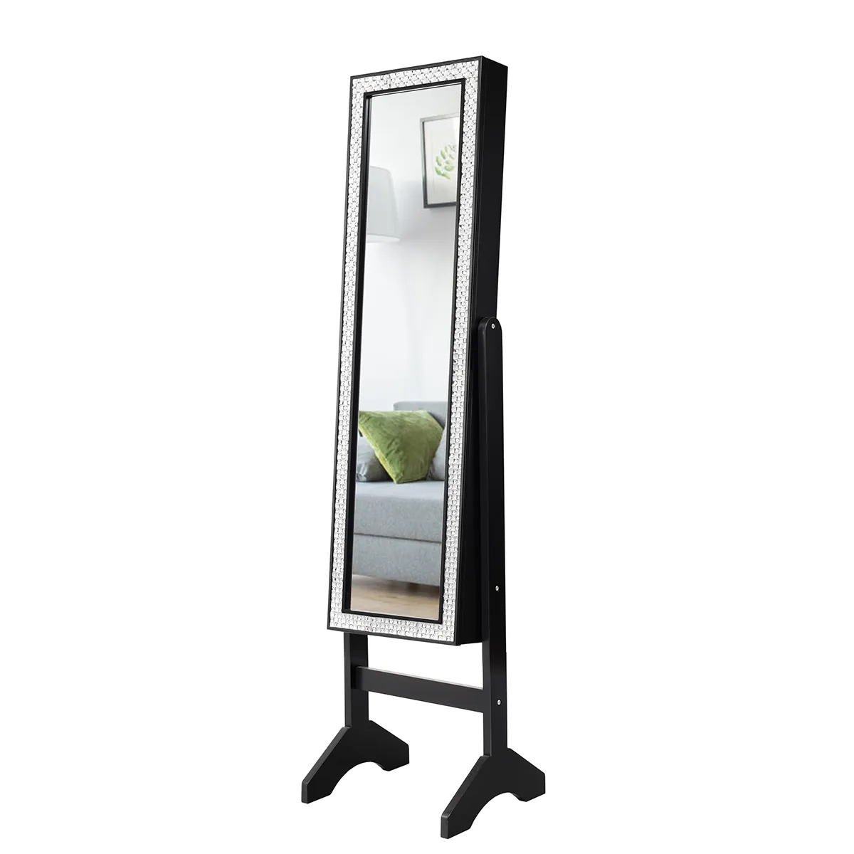 Gebouwd met superieur houten materiaal en bekleed met fluweel binnen, zal dit kastje uw favoriete collecties een gezellig thuis bieden. Er zijn zo veel ringen slots, ketting haken dat het u tijden zal duren om het te vullen. Na het uitzoeken van de dagelijkse sieraden, sluit u de deur zachtjes en de deurhouder zal helpen om het gesloten te houden. Met een doorzichtige spiegel over de hele lengte op de deur, geeft het u een hoofd-tot-teen zicht, wat perfect is voor de dagelijkse make-up routine. Rond de vier zijden van de spiegel, zijn er glinsterende hars diamanten waardoor deze sieraden kast kijken meer oogverblindend.