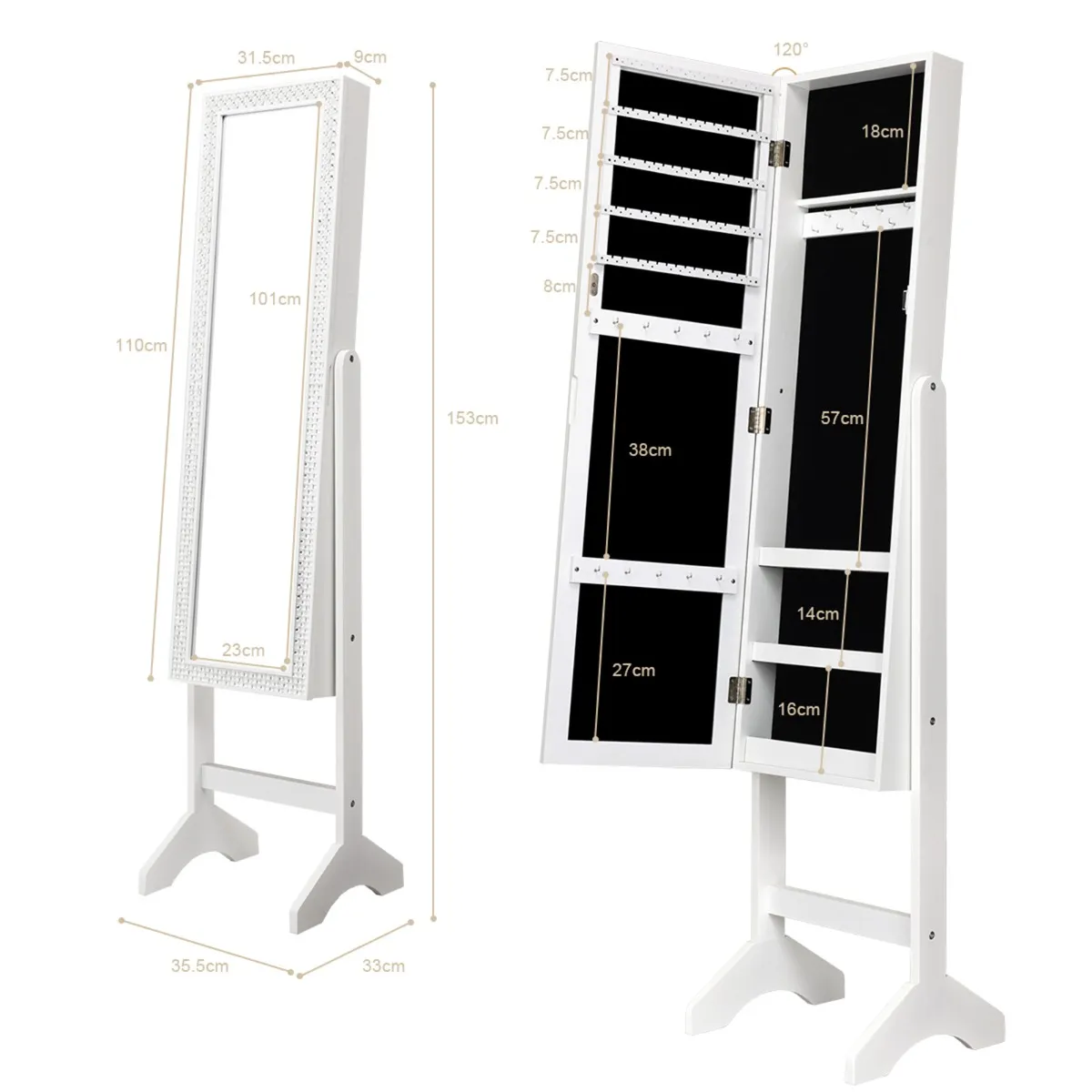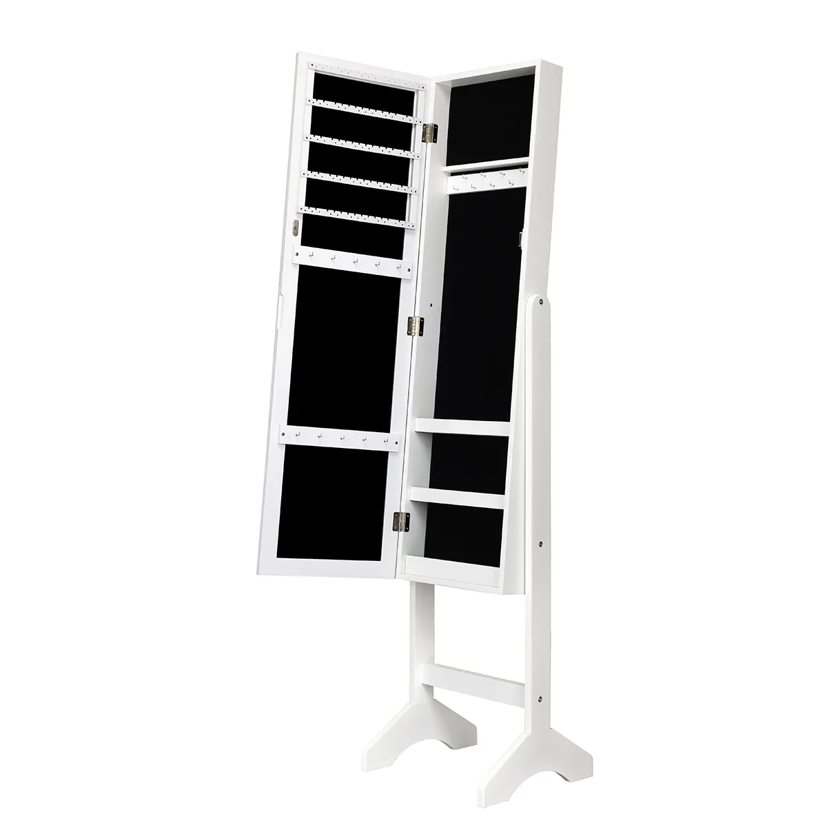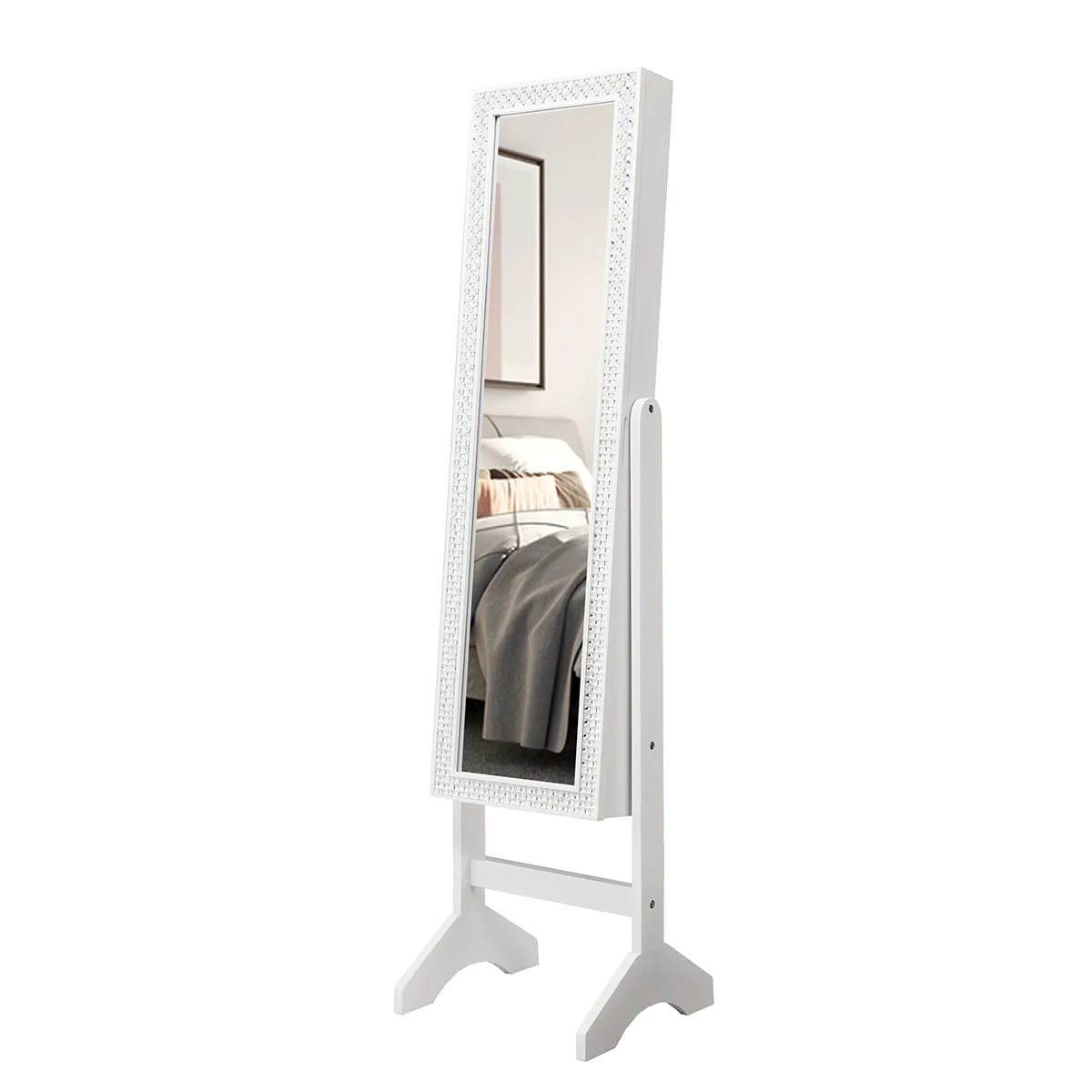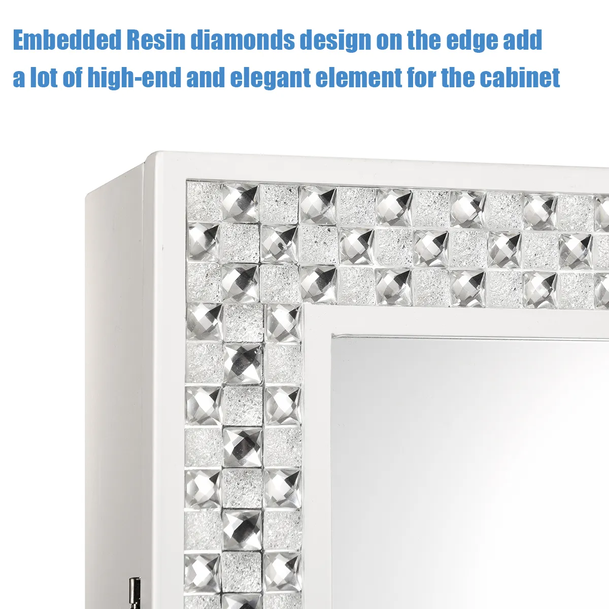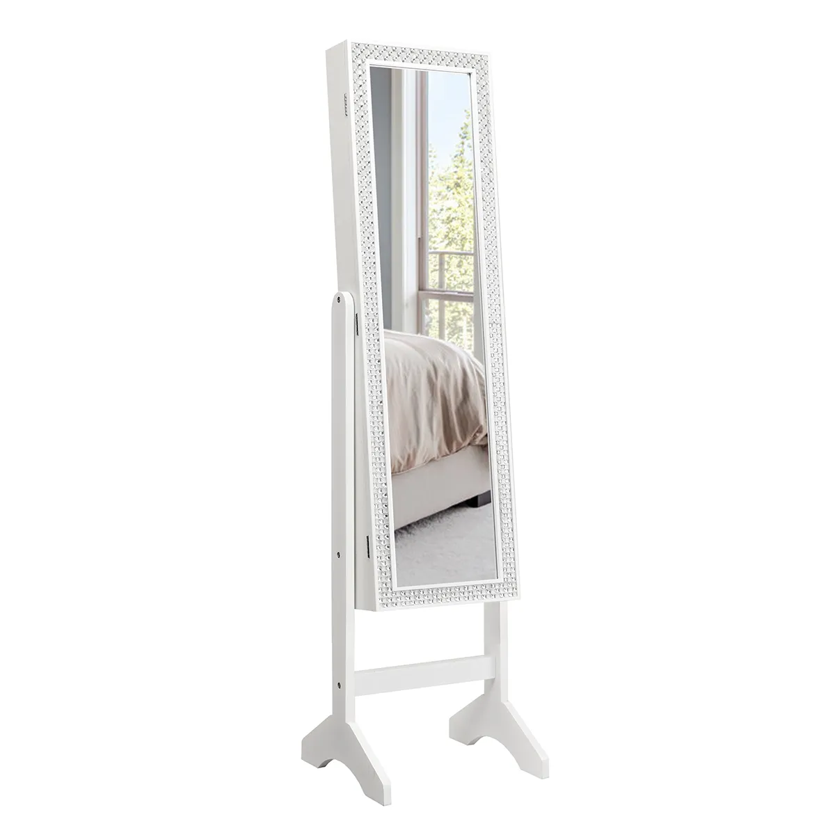 Gebouwd met superieur houten materiaal en bekleed met fluweel binnen, zal dit kastje uw favoriete collecties een gezellig thuis bieden. Er zijn zo veel ringen slots, ketting haken dat het u tijden zal duren om het te vullen. Na het uitzoeken van de dagelijkse sieraden, sluit u de deur zachtjes en de deurhouder zal helpen om het gesloten te houden. Met een doorzichtige spiegel over de hele lengte op de deur, geeft het u een hoofd-tot-teen zicht, wat perfect is voor de dagelijkse make-up routine. Rond de vier zijden van de spiegel, zijn er glinsterende hars diamanten waardoor deze sieraden kast kijken meer oogverblindend.