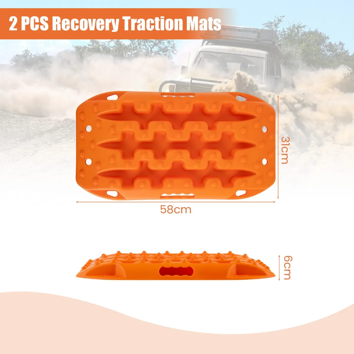 Het pakket bevat 2 offroad-tractieplanken. Elke tractiemat is gemaakt van robuust, maar licht nylonmateriaal en kan tot 10 ton dragen en extreme temperaturen van -30 °C tot 60 °C weerstaan. Deze zeer belastbare tractiemat is bovendien super flexibel, buigzaam en breekt niet zo gemakkelijk. Beide zijden van de tractiemat zijn voorzien van noppen en tanden om de wrijving tussen banden en grond te verhogen en zo doordraaien van de voertuigbanden te voorkomen.