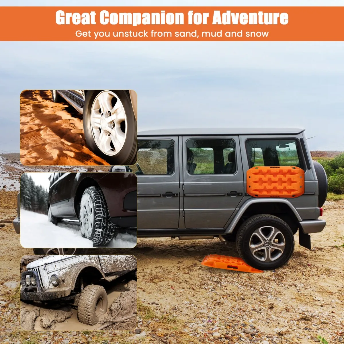 Veelzijdige tractiematten voor de berging: Elke tractiemat is zo gevormd dat hij onder de meeste banden past. Bij de levering zijn 2 tractiematten inbegrepen, die samen 2,5/5,5 kg wegen. De voor- en achterkant van de tractiemat zijn uitgerust met verbeterde noppen, die goed gepositioneerd zijn om in de banden te grijpen en het doordraaien van de voertuigbanden te voorkomen.