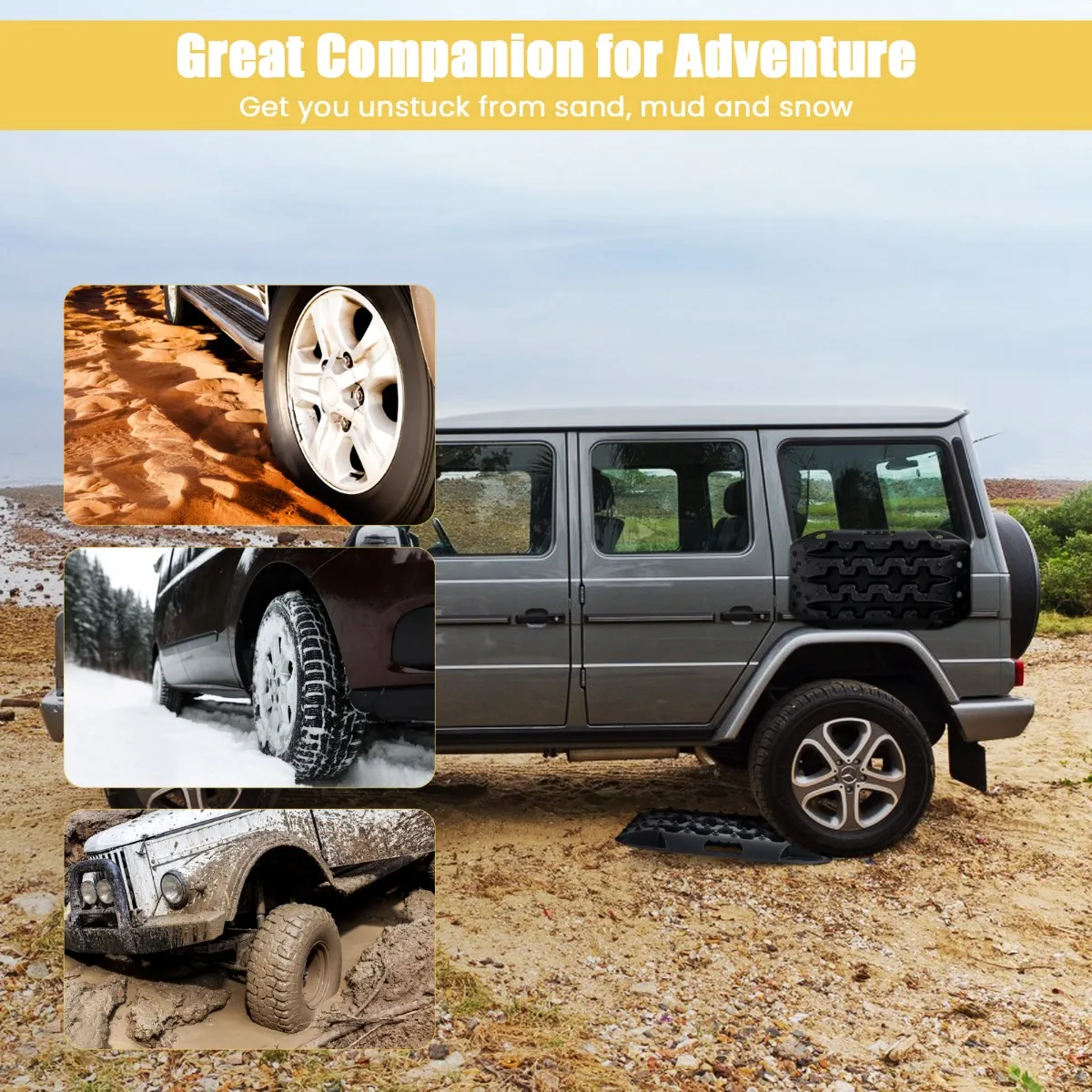 Het pakket bevat 2 offroad-tractieplanken. Elke tractiemat is gemaakt van robuust, maar licht nylonmateriaal en kan tot 10 ton dragen en extreme temperaturen van -30 °C tot 60 °C weerstaan. Deze zeer belastbare tractiemat is bovendien super flexibel, buigzaam en breekt niet zo gemakkelijk. Beide zijden van de tractiemat zijn voorzien van noppen en tanden om de wrijving tussen banden en grond te verhogen en zo doordraaien van de voertuigbanden te voorkomen.