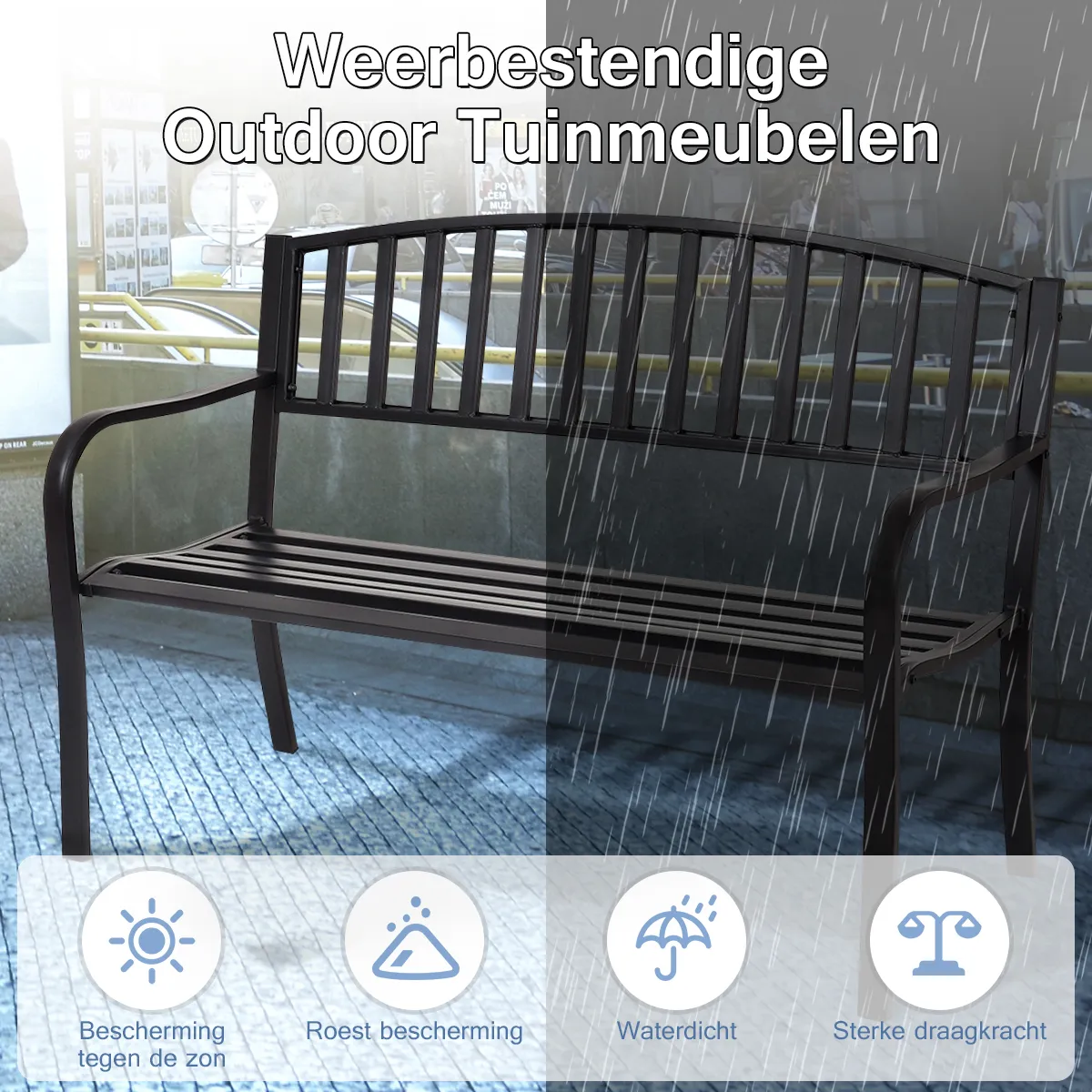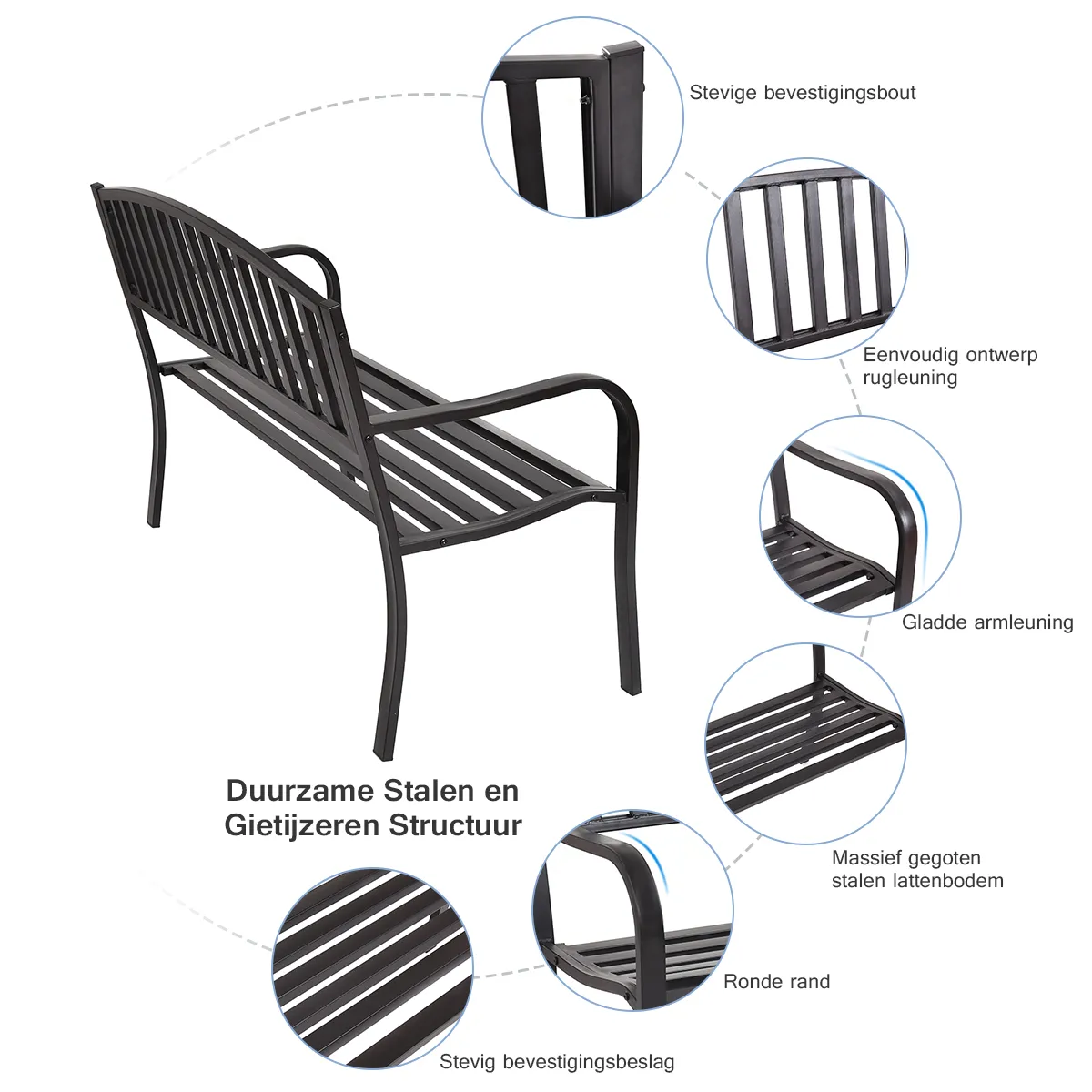 Prachtig tuinmeubilair: Prachtig ontworpen met een streepvormige rugleuning, deze stalen bank is zorgvuldig vervaardigd en voegt een vleugje stijl toe aan uw achtertuin, veranda, tuin, enz. Het klassieke ontwerp zorgt ervoor dat deze bank een ideale aanvulling is op elk tuinthema.