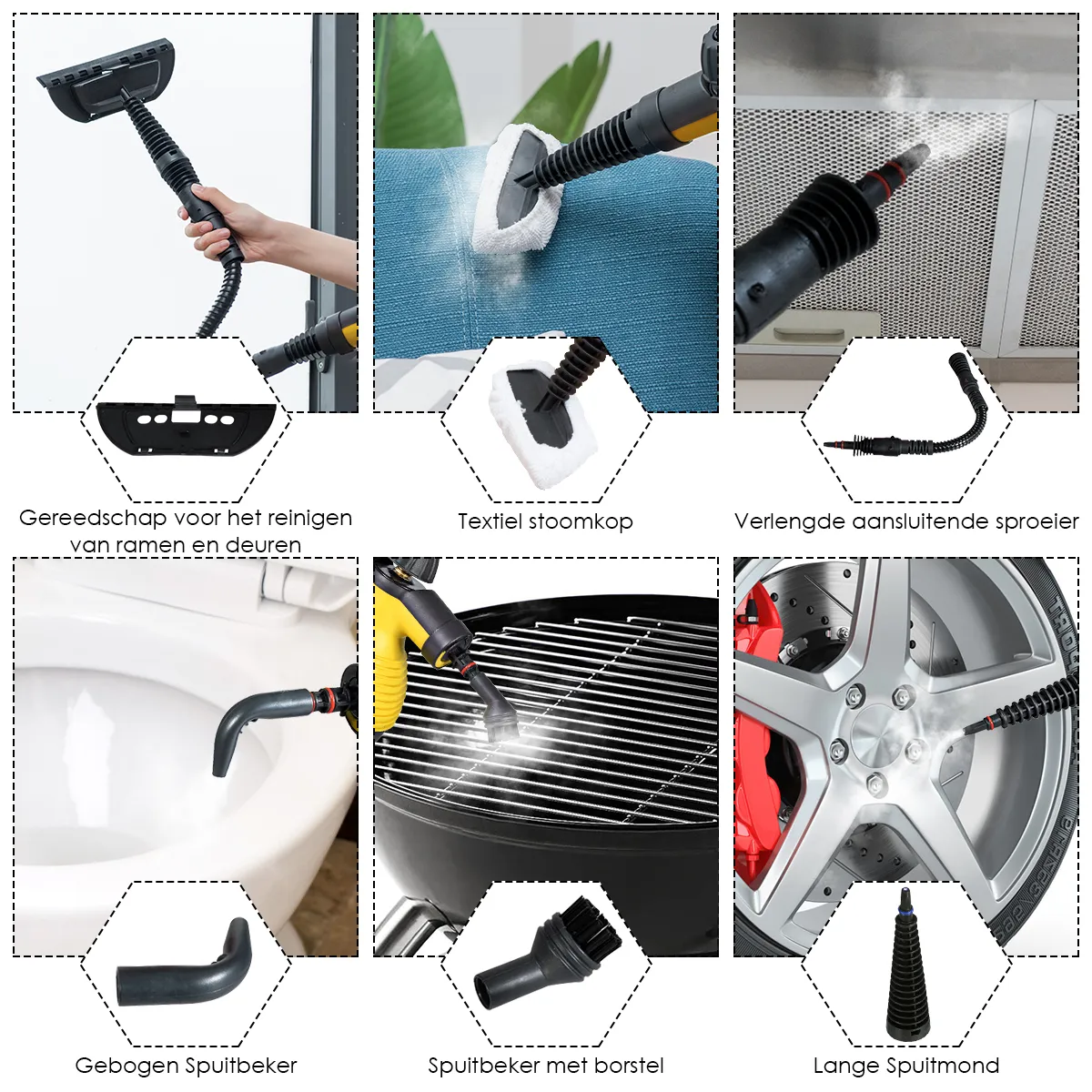 Multifunctionele stoomreiniger: Met deze stoomreiniger voer je eenvoudig alle dagelijkse schoonmaakklussen en het desinfecteren van voorwerpen uit. Het is ideaal voor het reinigen van gootstenen, fornuizen, werkbladen, koelkasten, ramen, toiletten, tegels, douchegordijnen, kattenbakken voor huisdieren, kattenbakken, autostoelen, grills, speelgoed, matrassen, wasgoed, linnengoed, dekbedovertrekken en meer.