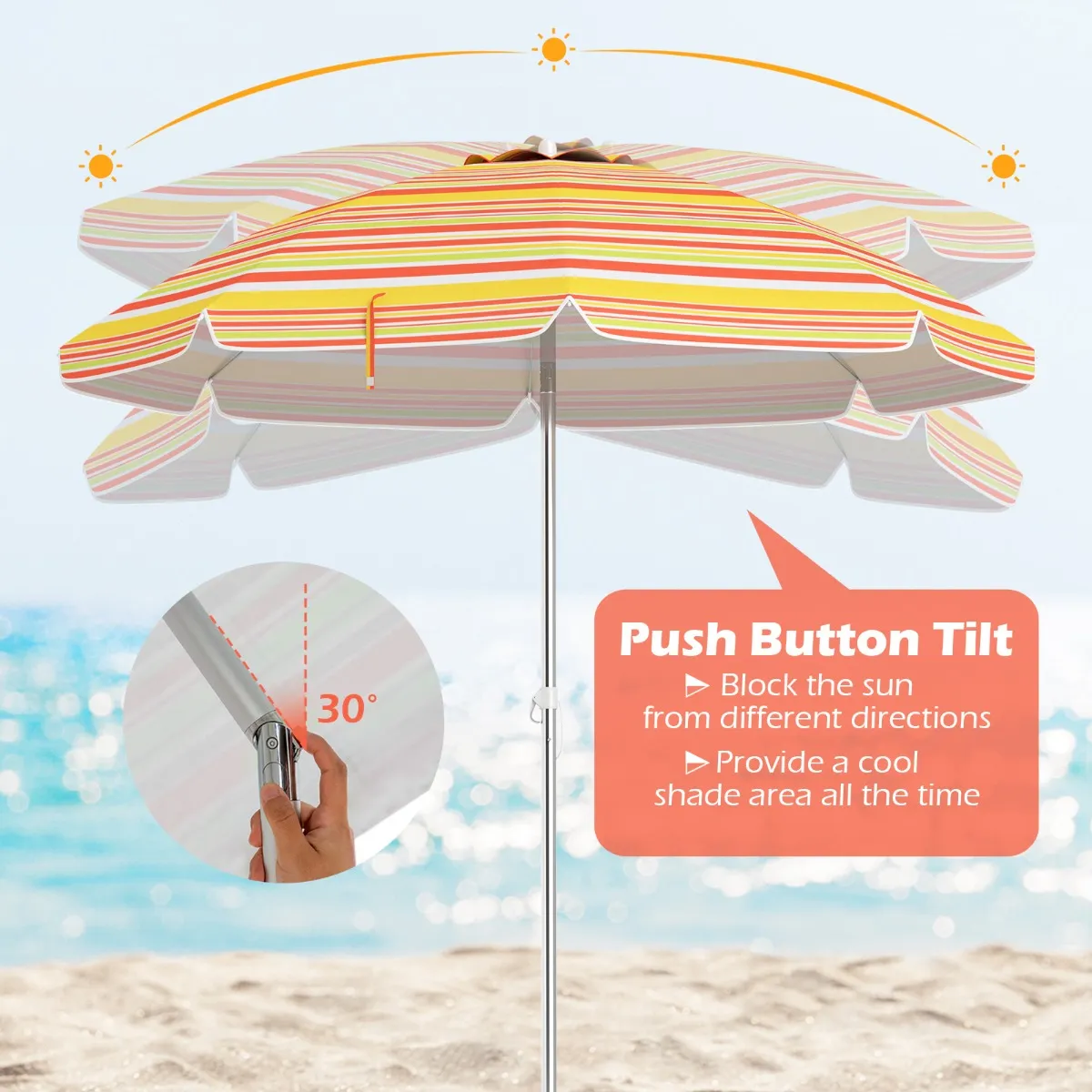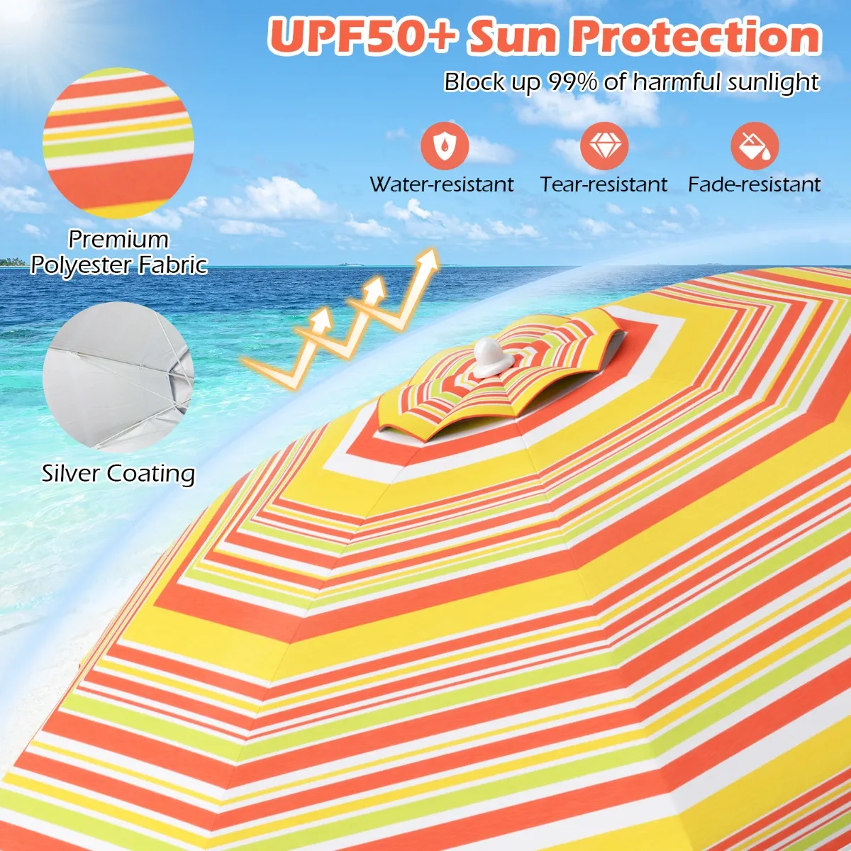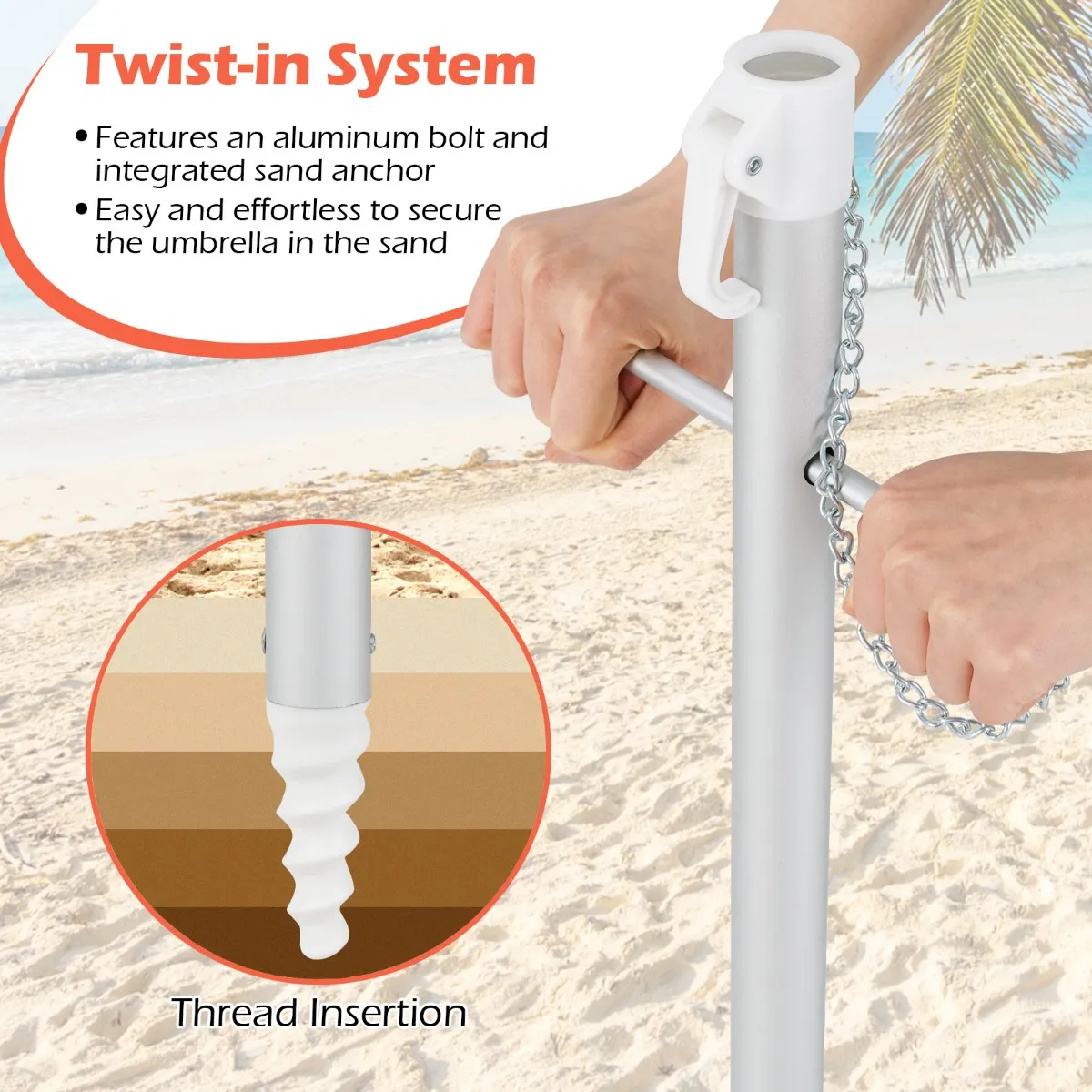 Stabiele bevestiging – Met een ingebouwd zandanker en een aluminium draaimechanisme plaats je de parasol moeiteloos in het zand, waardoor hij stevig blijft staan. Â