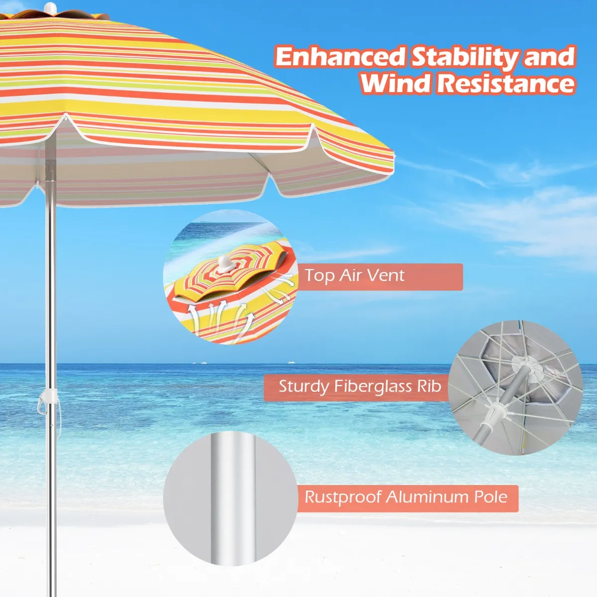Windbestendig & stevig – De ventilatieopening aan de bovenzijde verbetert de luchtcirculatie en vermindert windweerstand. De stevige glasvezelribben en de roestvrije aluminium steel zorgen voor extra stabiliteit en duurzaamheid. Â