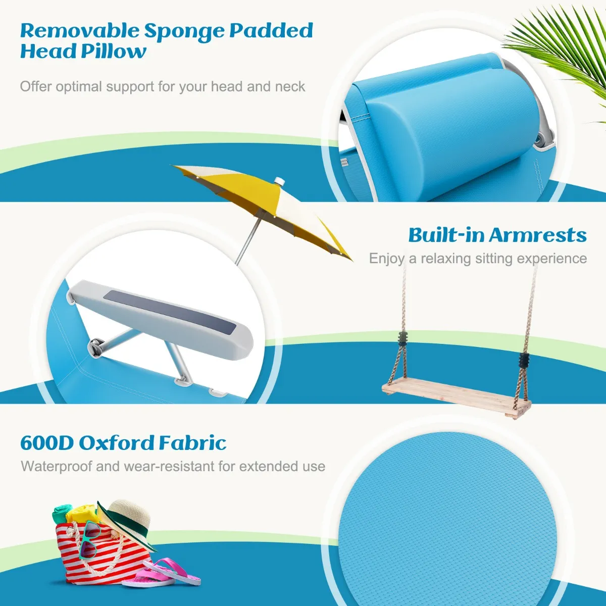 Verstelbare rugleuning en gewatteerde hoofdsteun: De in 5 standen verstelbare rugleuning zorgt voor naadloze overgangen van een rechtopstaande positie naar een volledig liggende positie om te zonnebaden. Voor extra comfort is de strandstoel voorzien van een zacht, met spons gevuld kussen en armleuningen om uw hoofd en armen te verwennen terwijl u buiten ontspant.