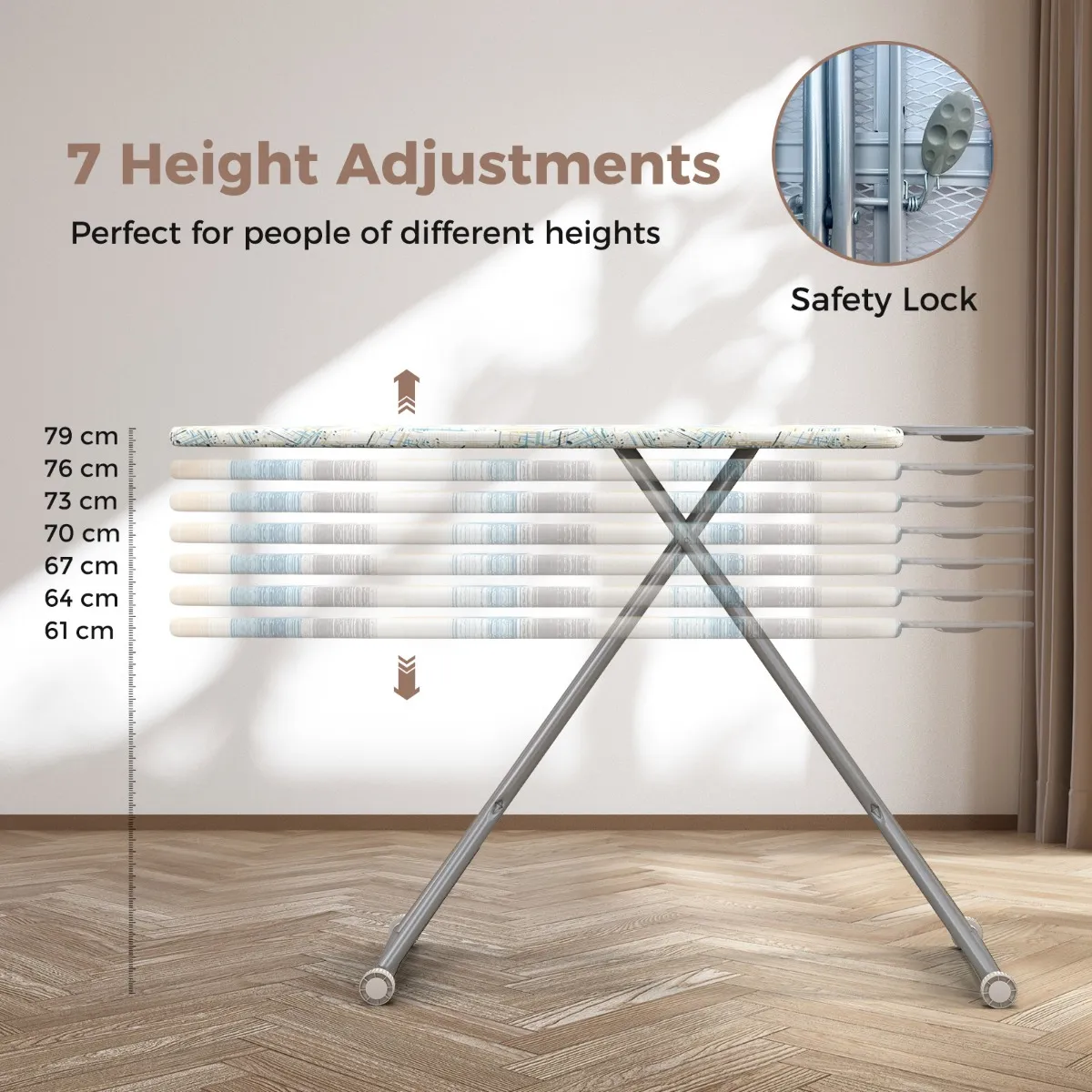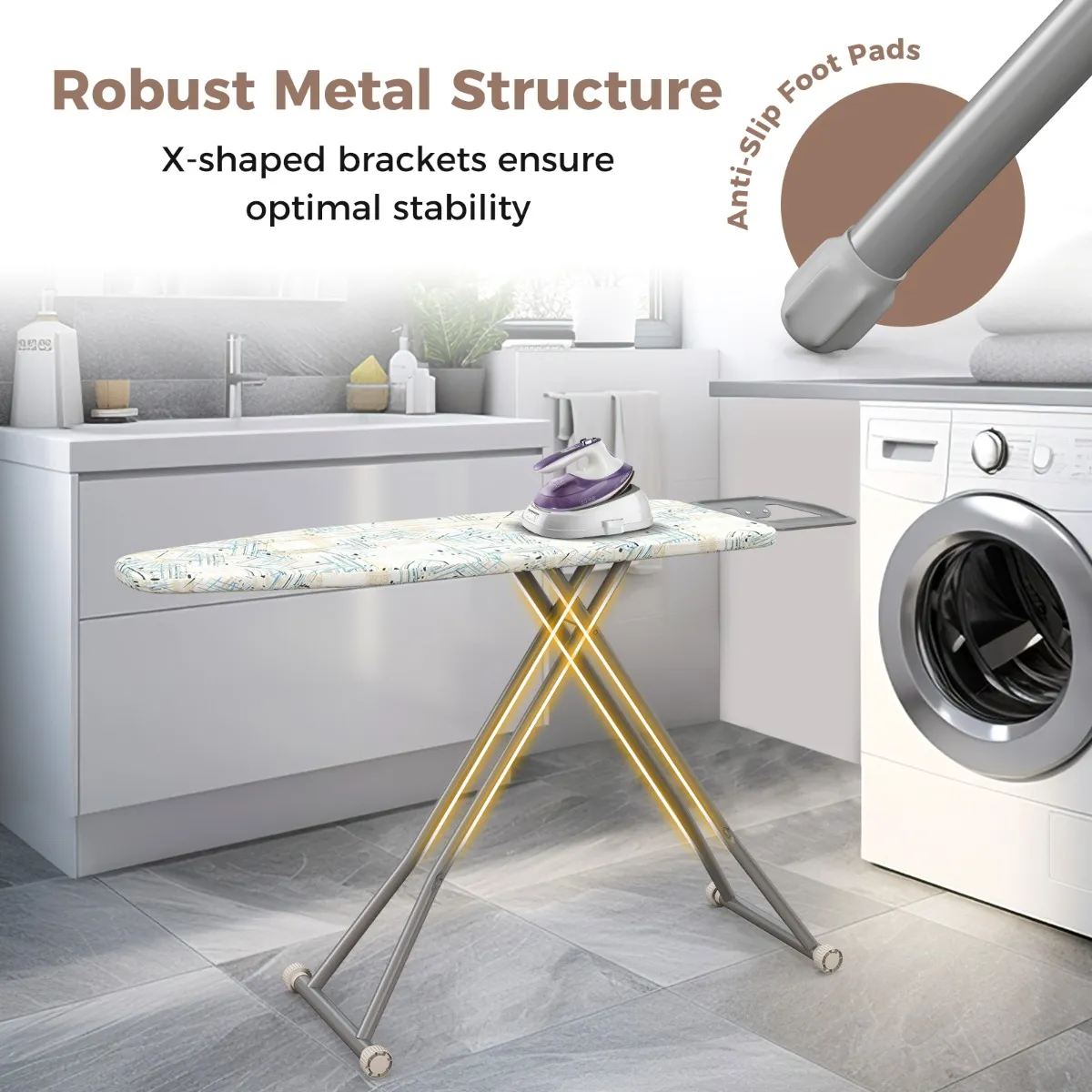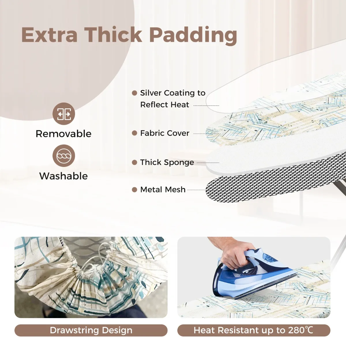 【Beschermend ontwerp met 4 lagen】: Deze strijkplank heeft een wasbare stoffen hoes voor eenvoudig onderhoud, een dikke schuimlaag die als kussen fungeert om strijkvlekken te voorkomen en een metalen gaaslaag voor een goede stoomafgifte.