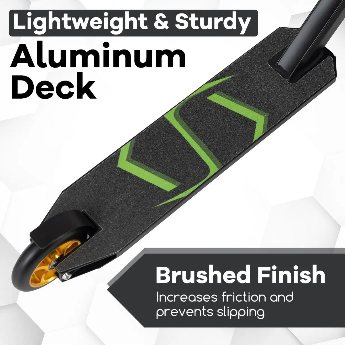 Deze professionele stuntstep is ontwikkeld voor kinderen vanaf 10 jaar en is perfect voor beginners en tieners die de wereld van de freestyle-step willen verkennen. De step beschikt over 2 PU-wielen met hoge rebound die door ABEC-7-lagers worden gedragen en voor soepel glijden over een groot aantal wegoppervlakken zorgen. Het brede aluminium dek biedt voldoende voetruimte en garandeert een stabiele basis voor trucs en manoeuvres. Uitgerust met een betrouwbaar stuur, antislip handgrepen en een achterwielrem biedt deze stuntstep je kinderen een veilige rit. De structuur is beveiligd met een 4-schroefklem, wat bijdraagt aan de algemene stabiliteit en betrouwbaarheid. Over het algemeen vergemakkelijkt het lichte ontwerp het dragen en manoeuvreren voor jonge bestuurders.